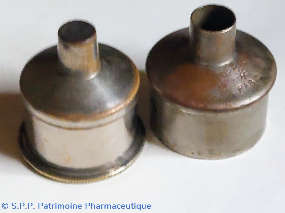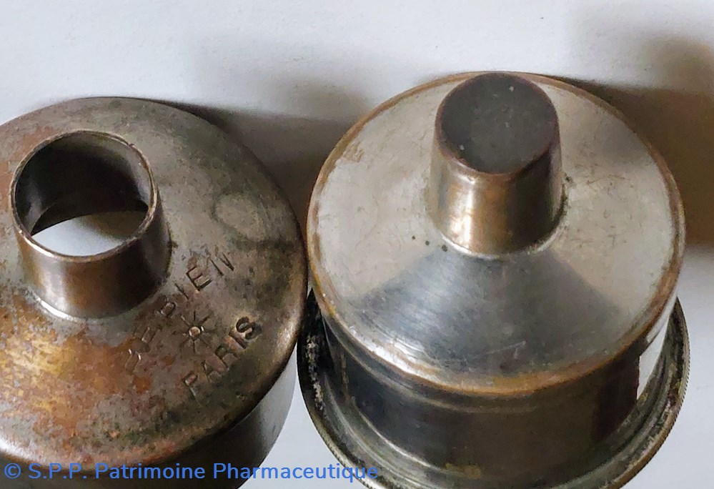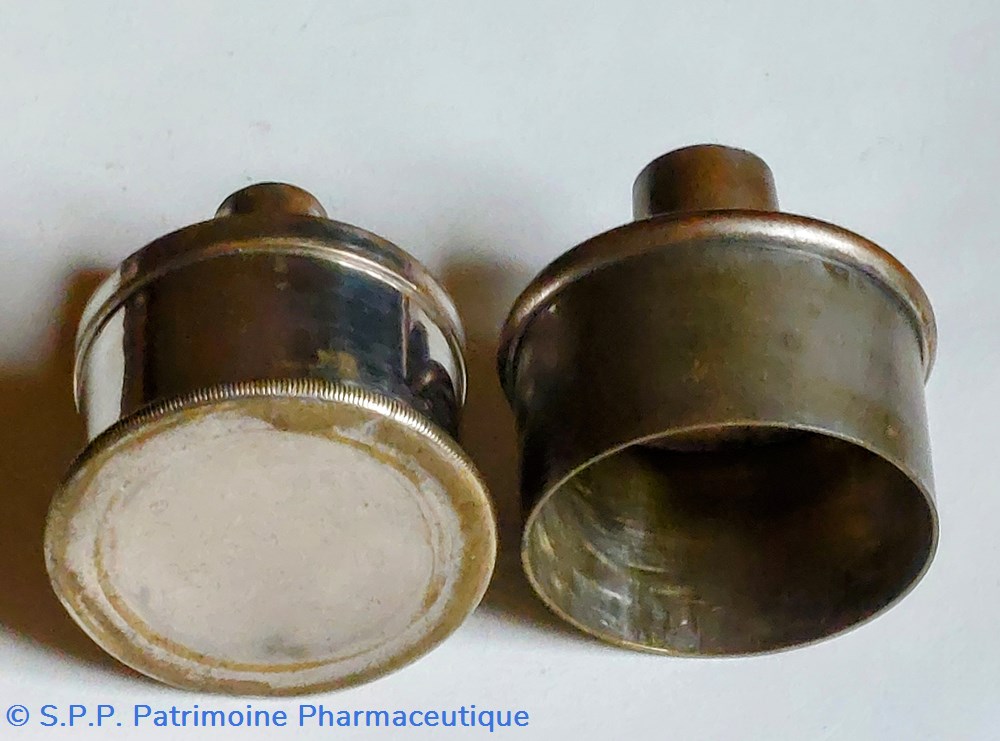 2- Une pièce métallique amovible venant coiffer entièrement le socle. La partie supérieure de diamètre 2 cm est ouverte. Hauteur totale 5.5 cm Diamètre base 4.5 cm.