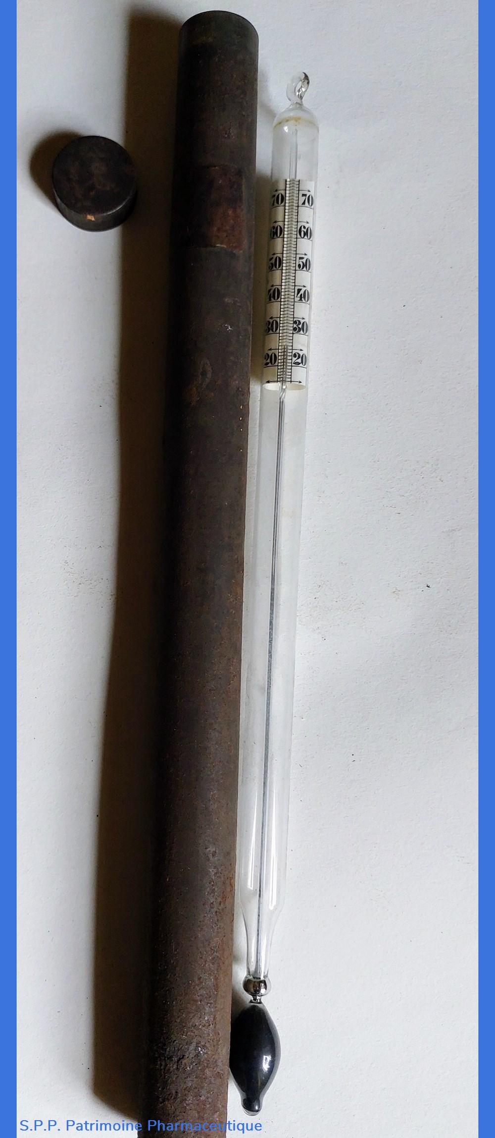 Thermomètre long de 30 cm et gradué de de 20 à 70 Centigrades.
