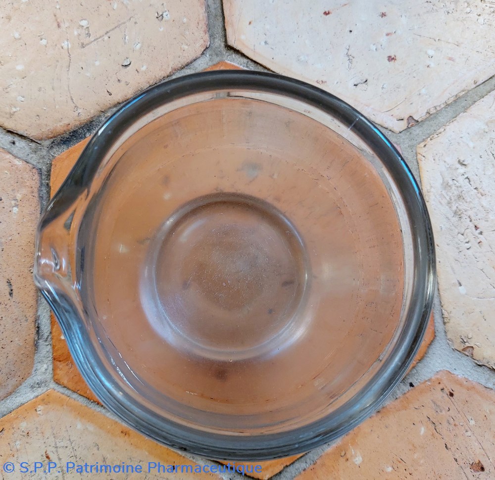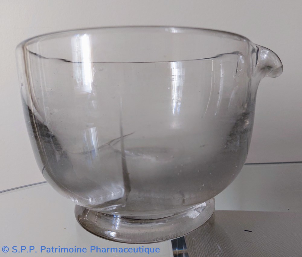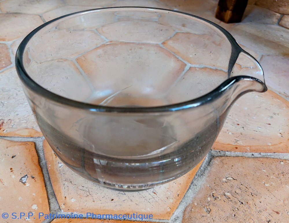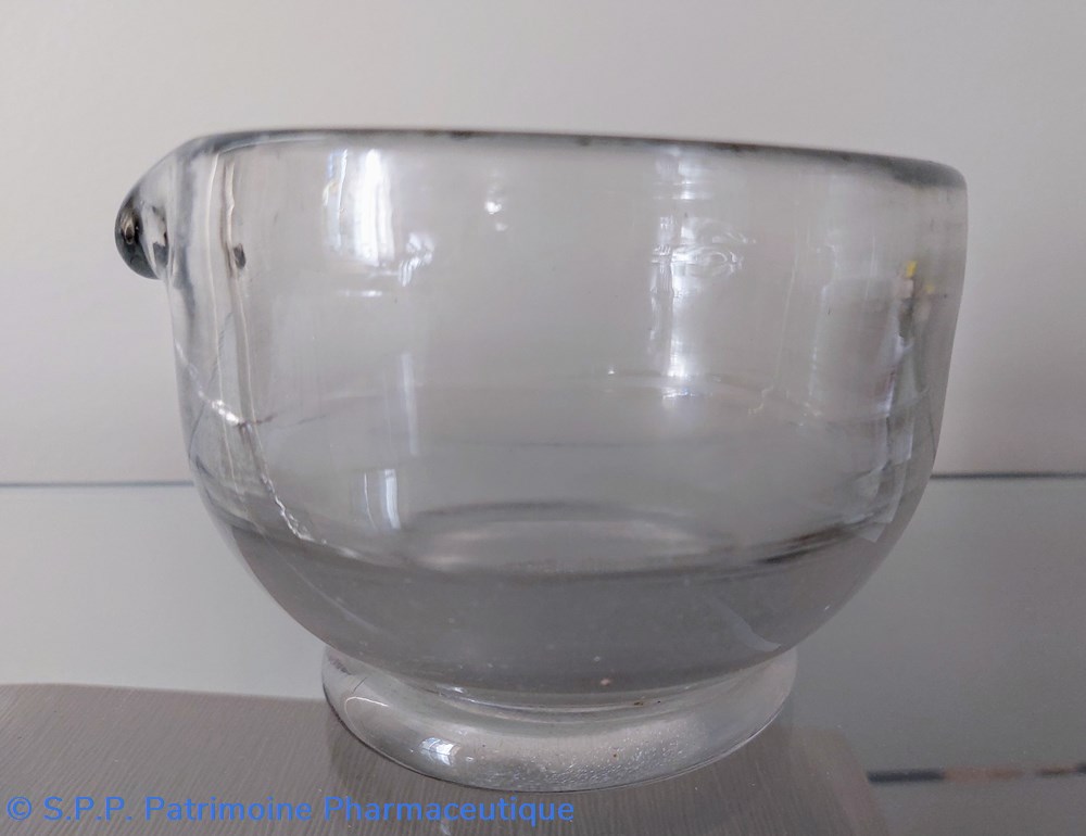 Mortier de laboratoire en verre ( épaisseur 5 mm) sur pied avec bec verseur.