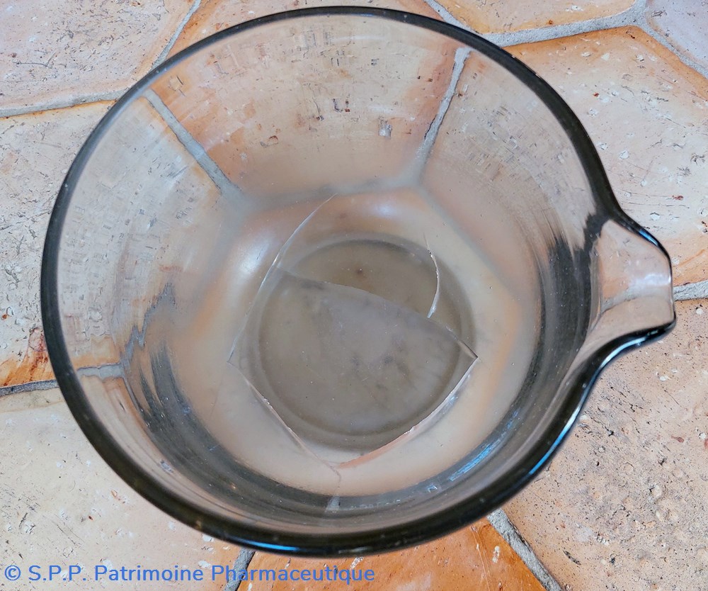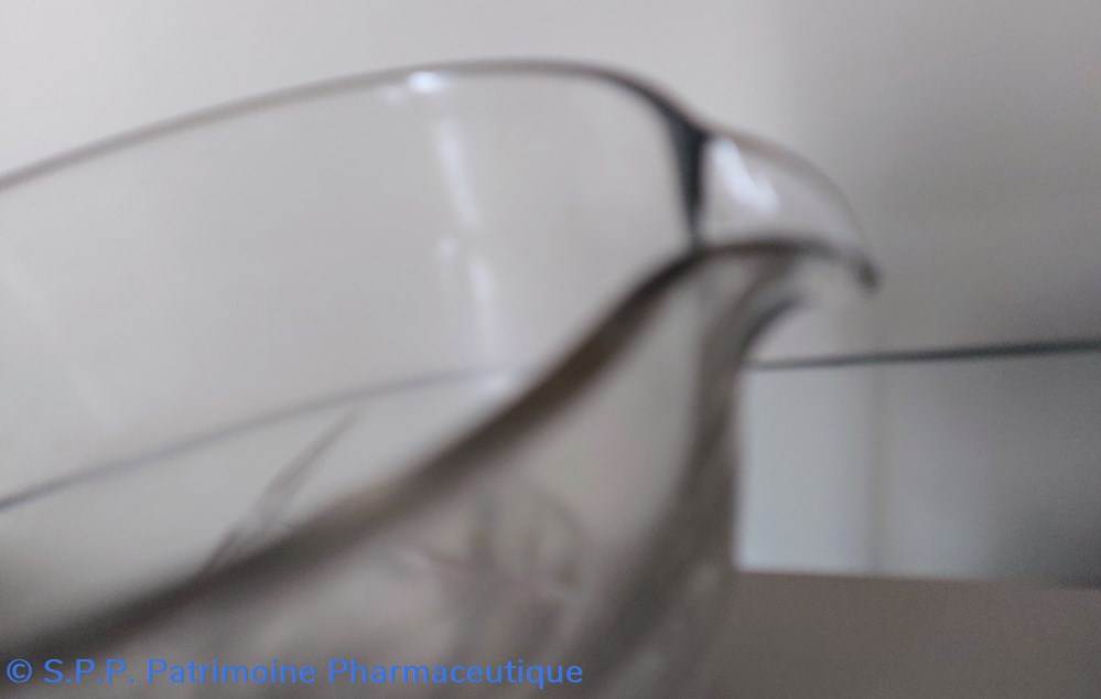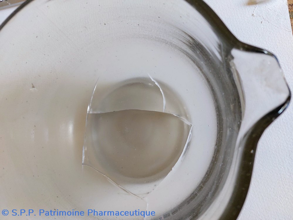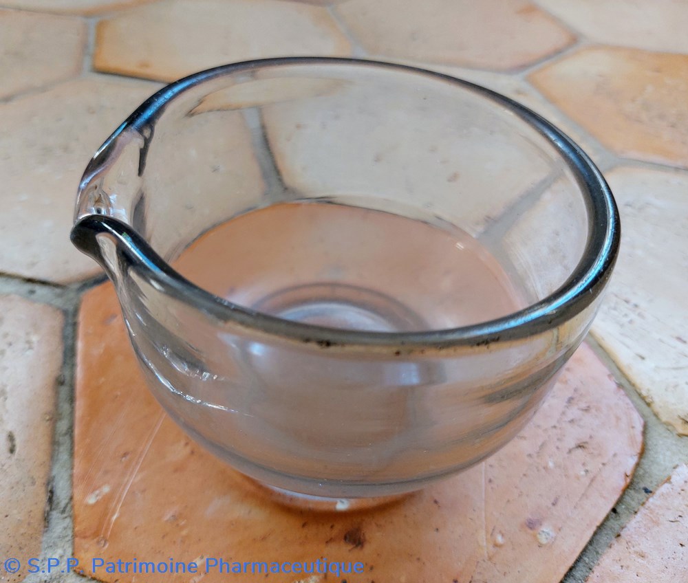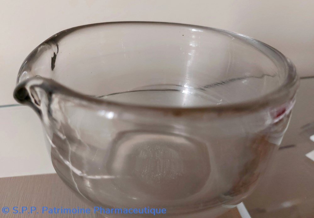 Mortier de laboratoire en verre ( épaisseur 5 mm) sur pied avec bec verseur.
