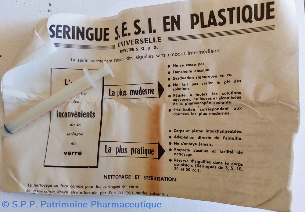 Une notice vante les avantages de La Seringue SESI en plastique " La Seule permettant l'emploi des aiguilles sans embout intermediaire"