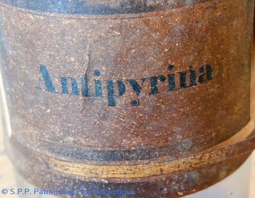 Étiquette en mauvais état noircie par le temps. " Antipyrina".