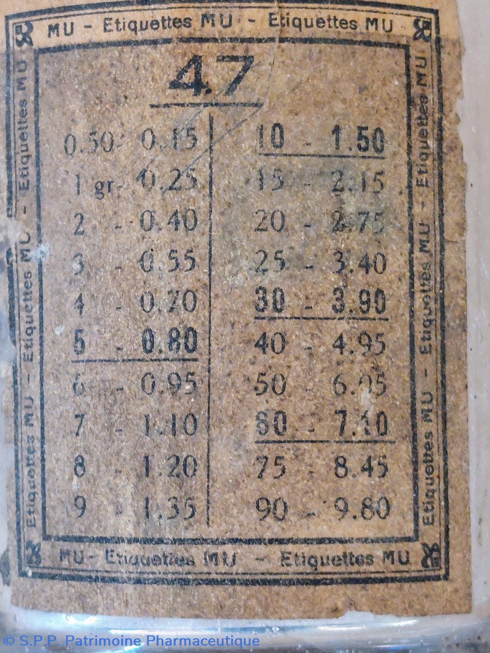 Étiquette "47" affichant un tableau de correspondance chiffré. L'échelle est chiffrée de 0.50 gr à 90 gr.
