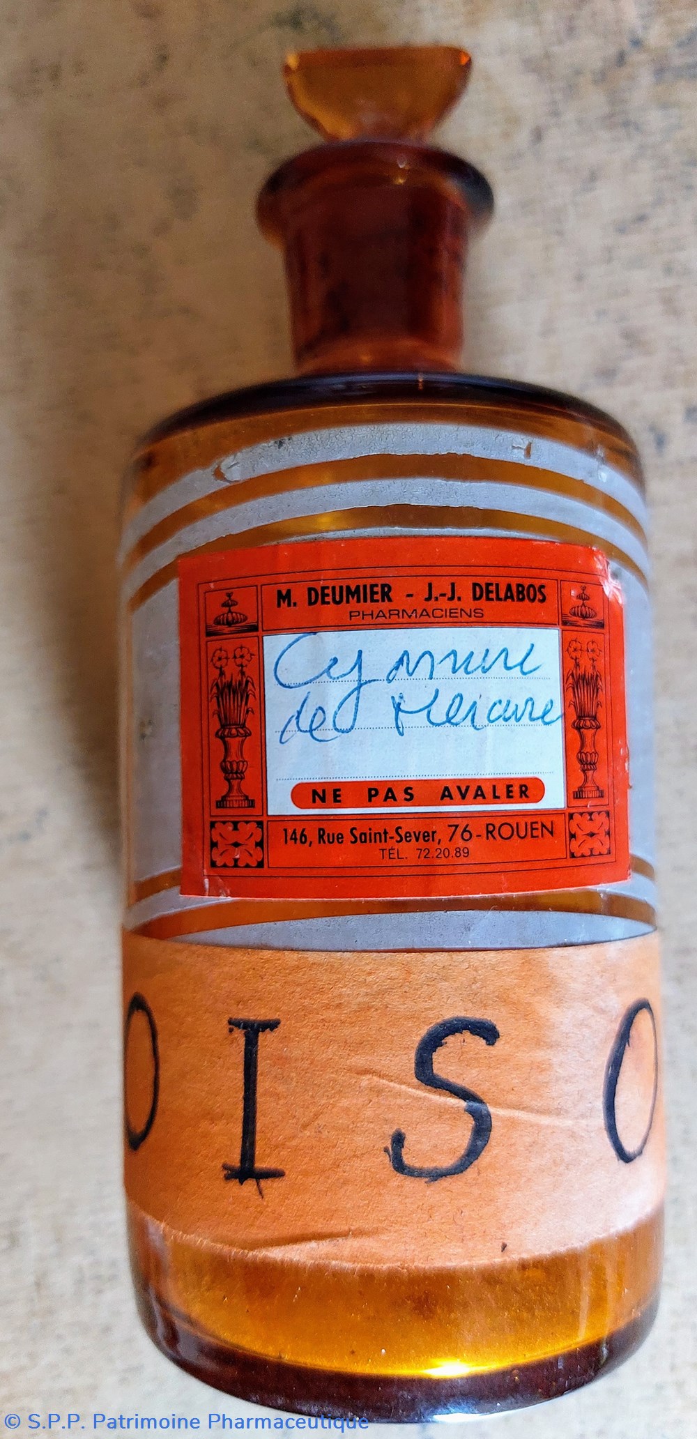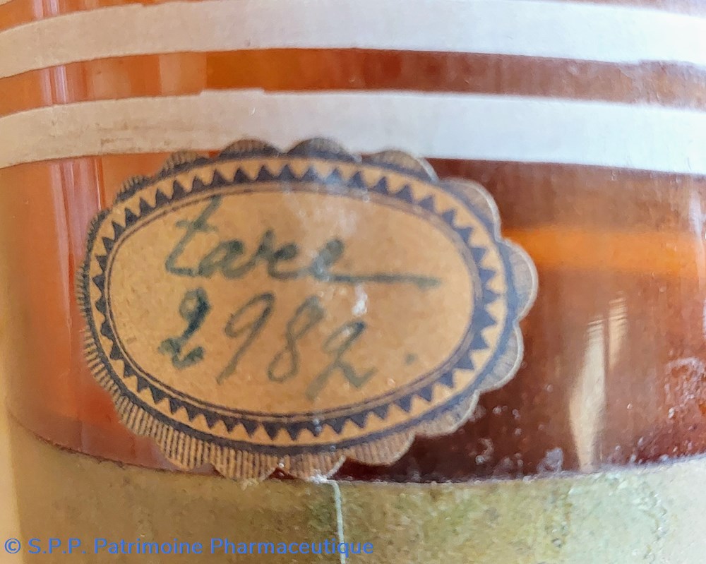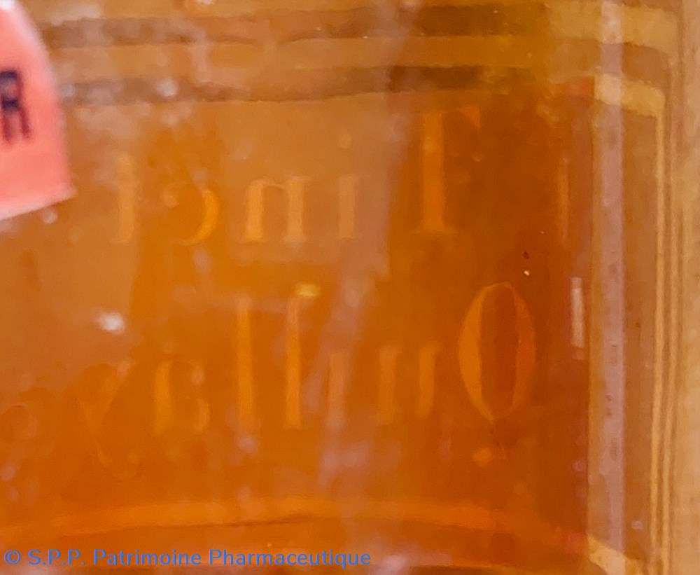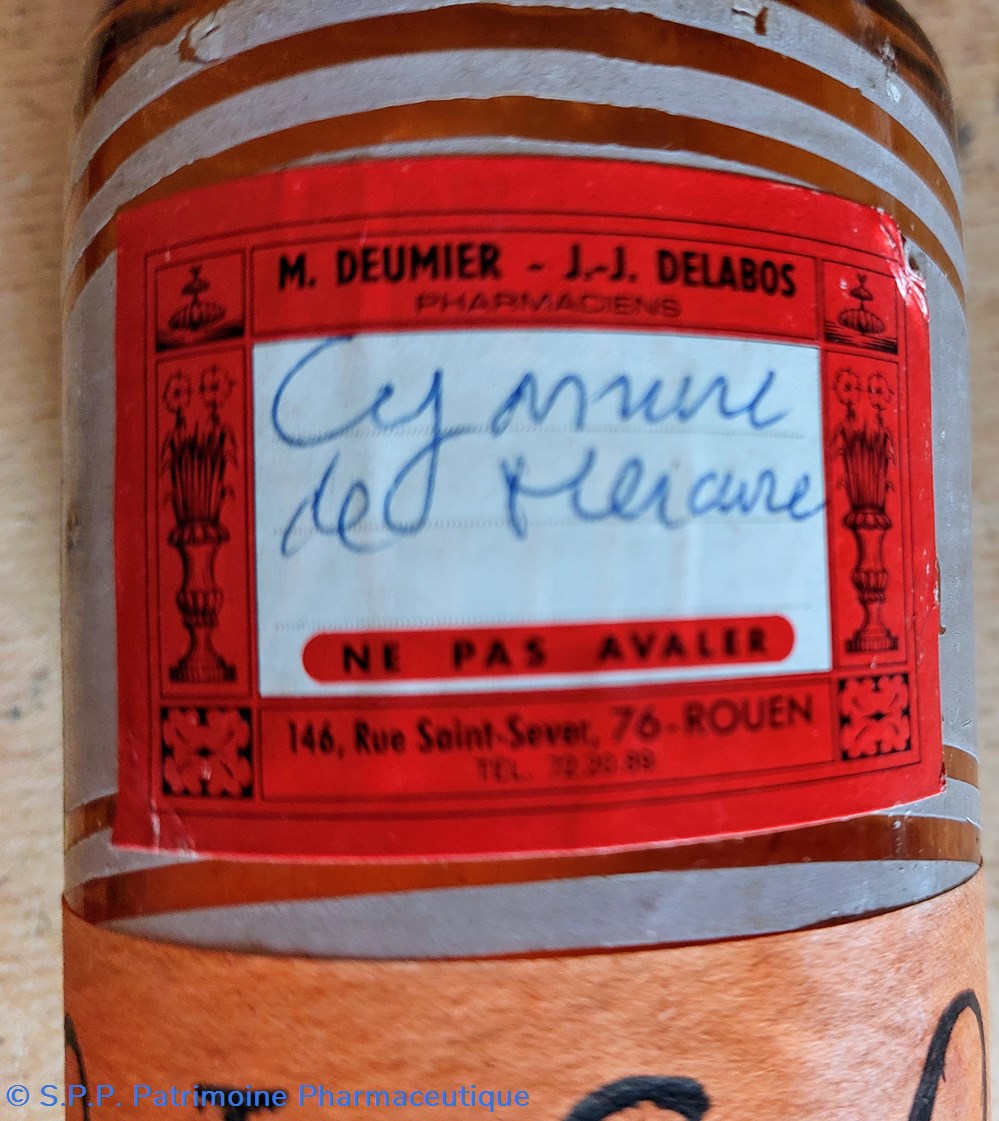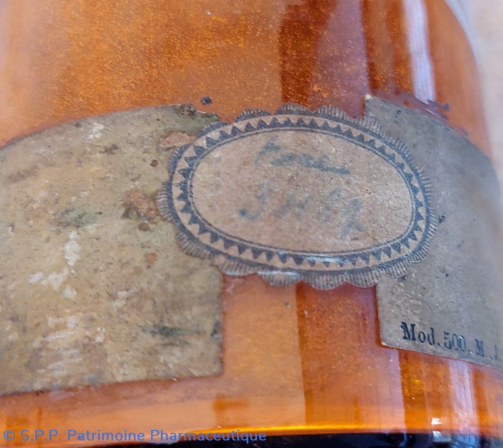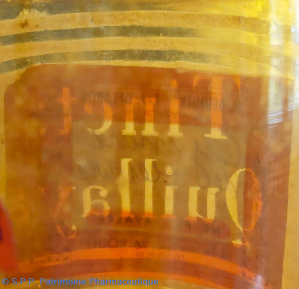 L'usage initial selon l'inscription imprimée avec lettres transparentes " Tinct:Quillaia" cet étiquetage est masqué par une étiquette des Pharmaciens Deumier et Delabos à Rouen "CYANURE de MERCURE"