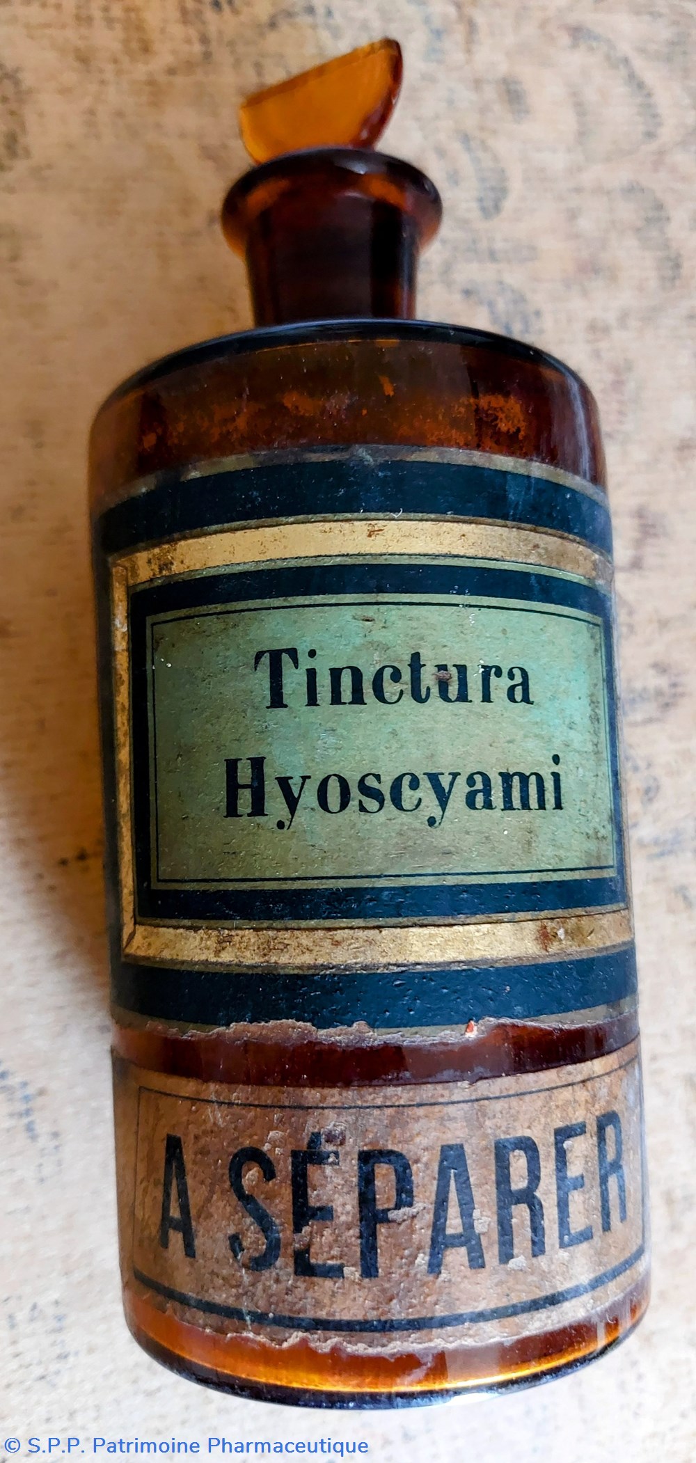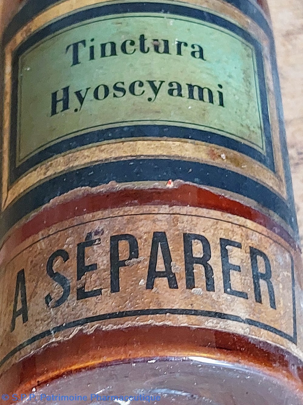 Double étiquetage " Tinct : Hyoscyami" Inscription imprimée avec lettres transparentes. / Une étiquette en papier fond noir entourage or Écriture sur fond vert olive.