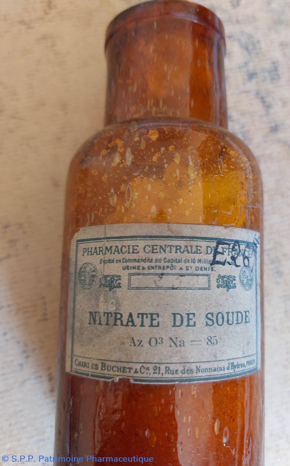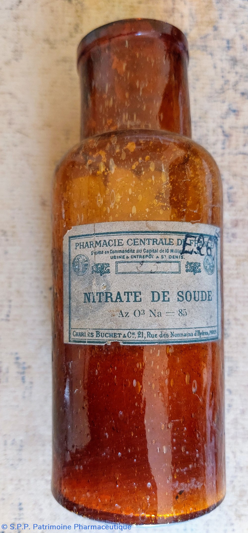 Étiquette de la Pharmacie Centrale de France " Nitrate de Soude" 1500