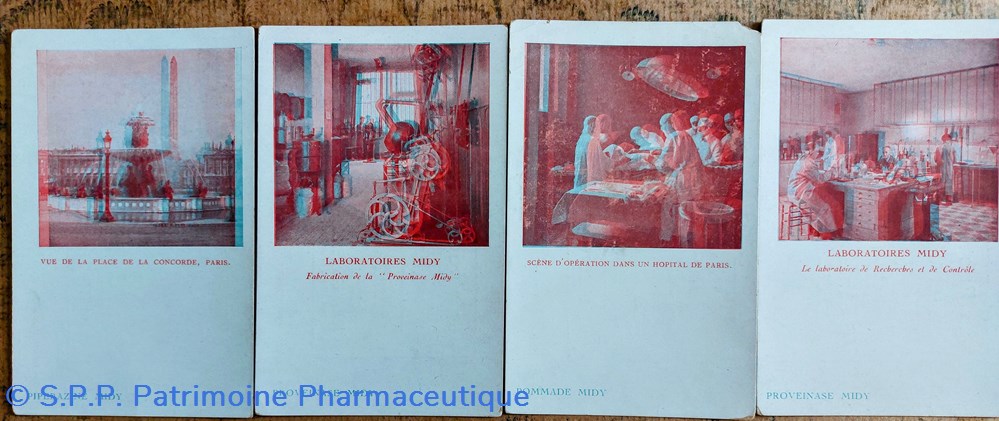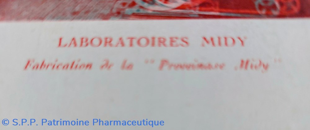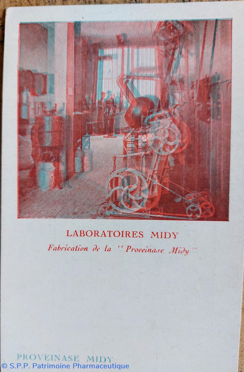 Recto :" Fabrication de la Proveinase Midy" Photographie avec effet graphique et impression de relief. Technique Lomochrome ?