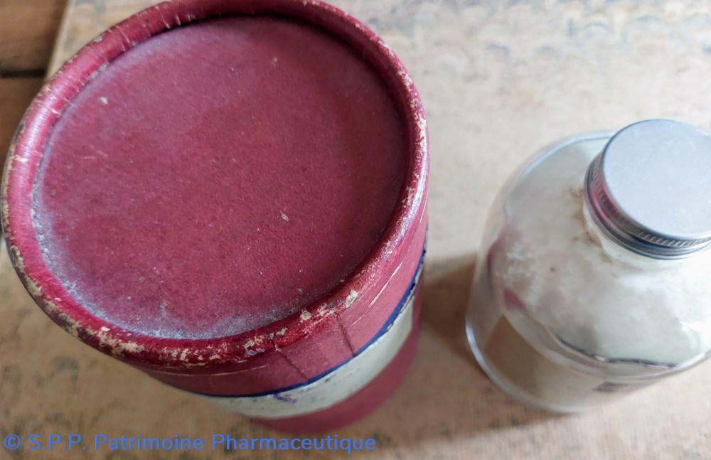 Un flacon en forme de grosse bouteille fermée avec un bouchon métallique vissé et protégé dans un coffret cylindrique en carton de couleur bordeaux.