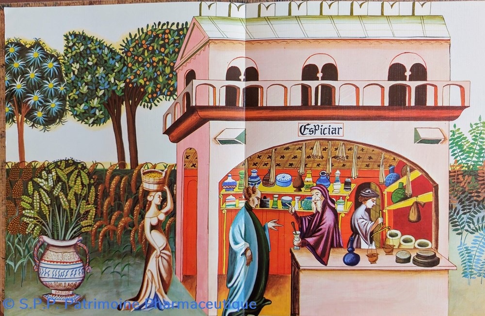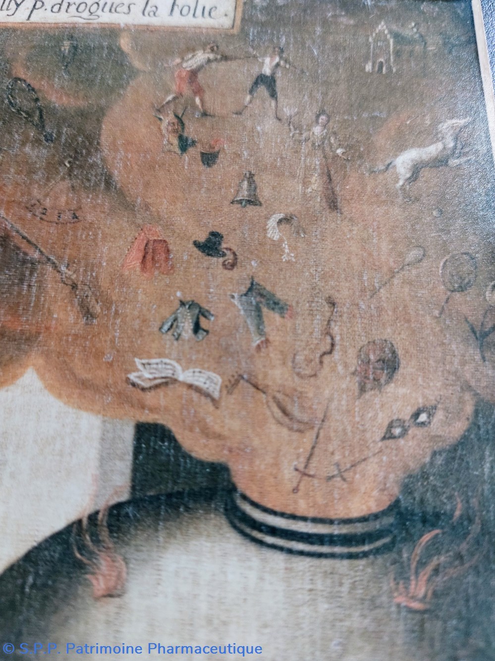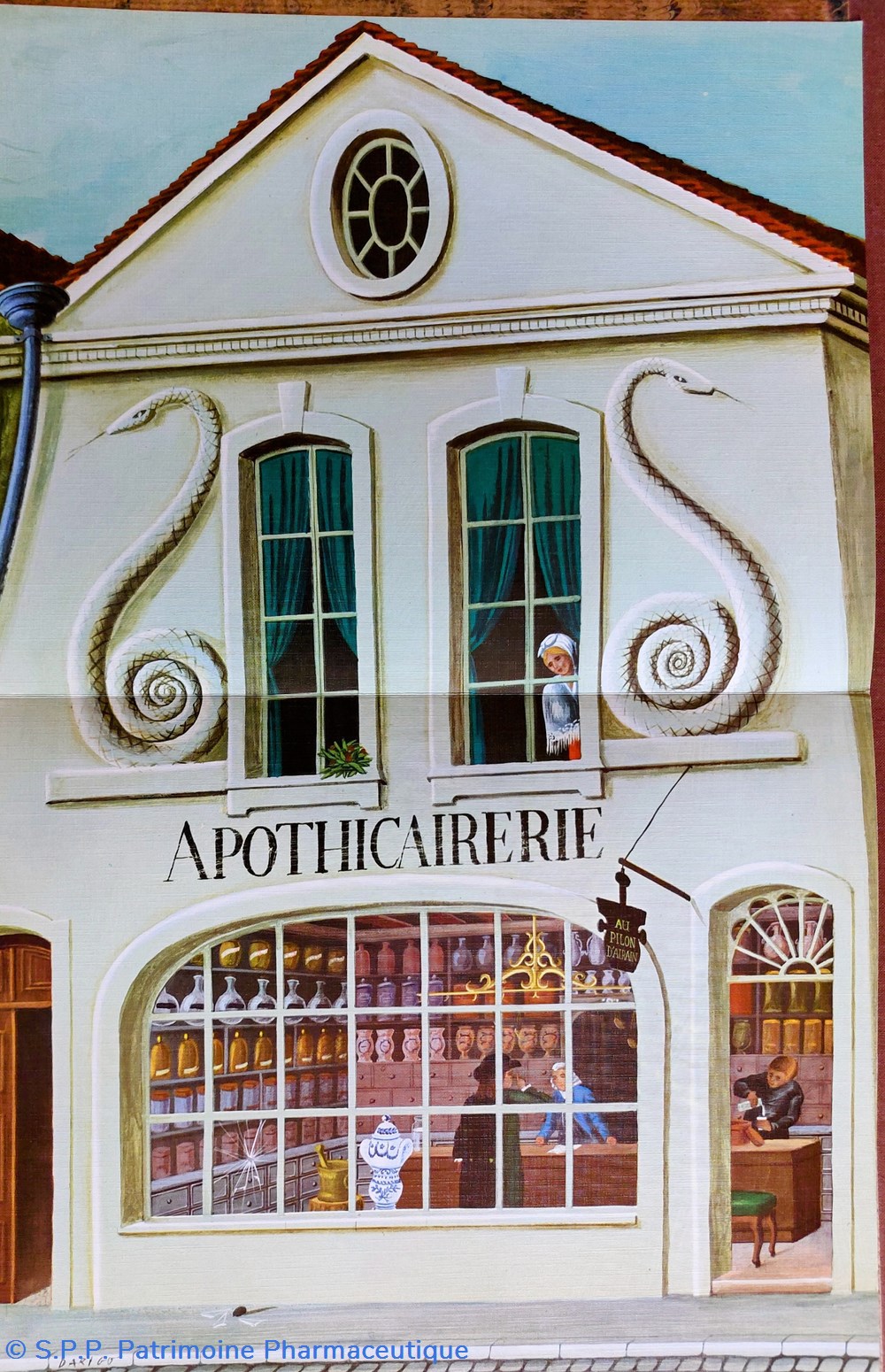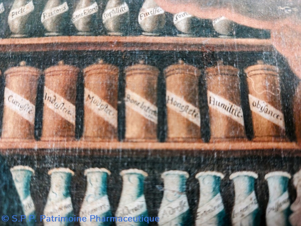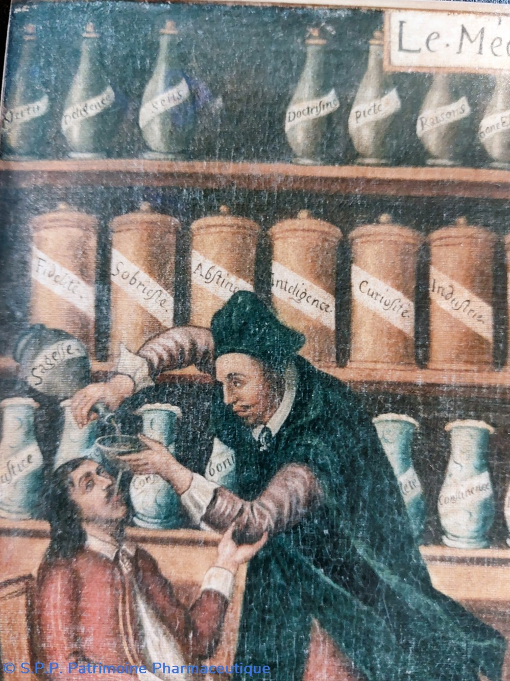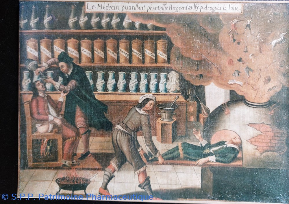 C'est un document significatif des pratiques de charlatanisme qui nous renseigne sur la disposition intérieure d'une officine dont les vases, soigneusement rangés , signalent des contenus plus allégoriques qu'efficaces.