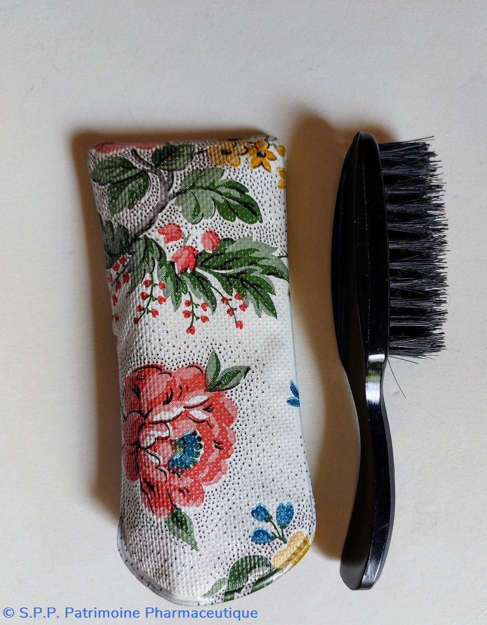 Petite brosse à Cheveux de sac à main en plastique noir dans un étui en plastique décor fleuri.