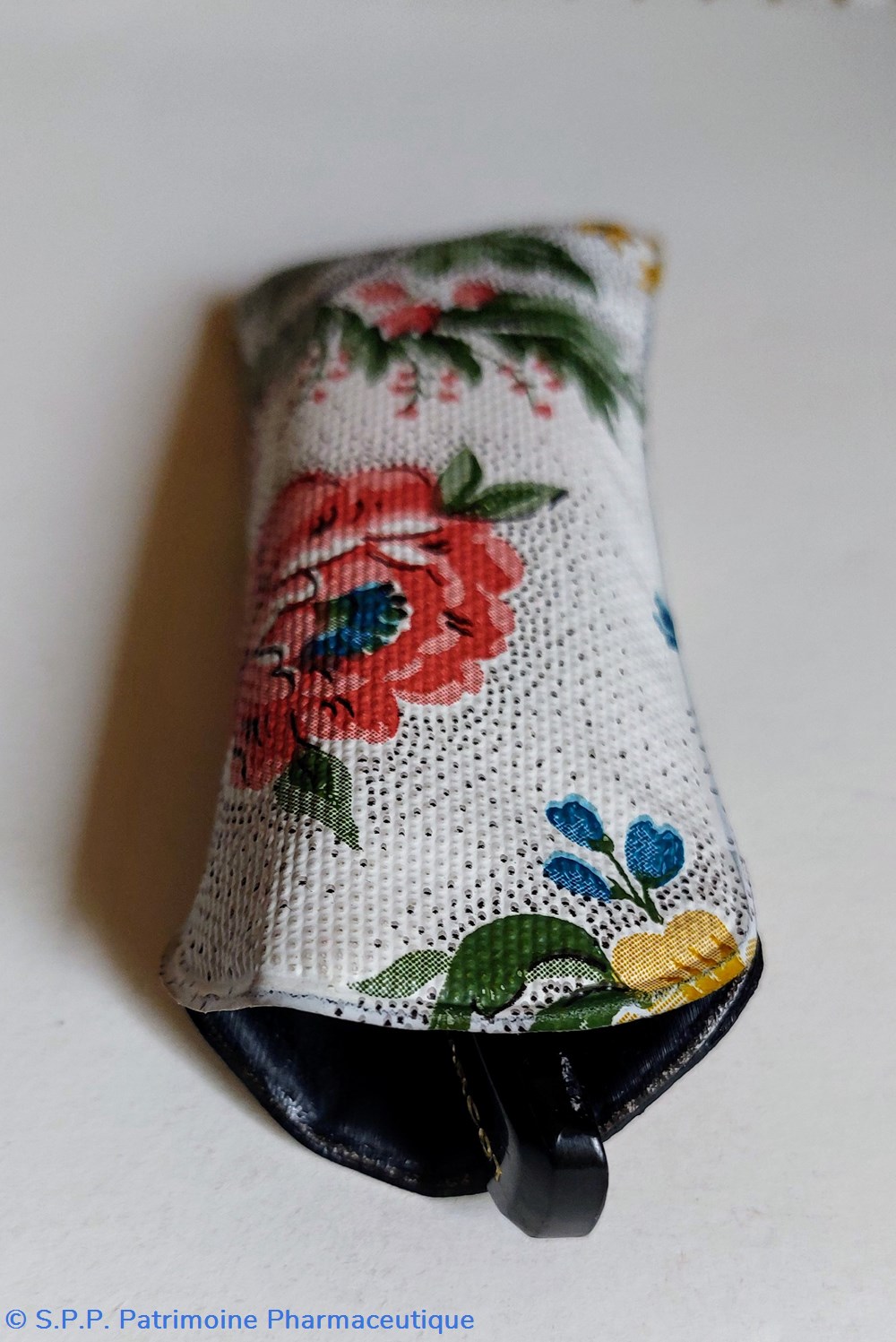 Loupe fixée dans un étui souple en plastique noir.