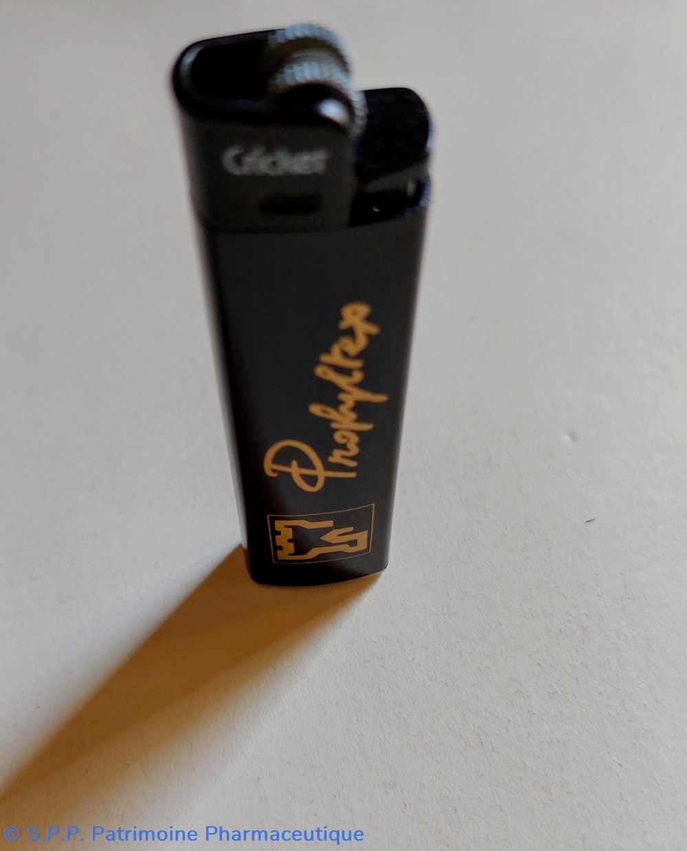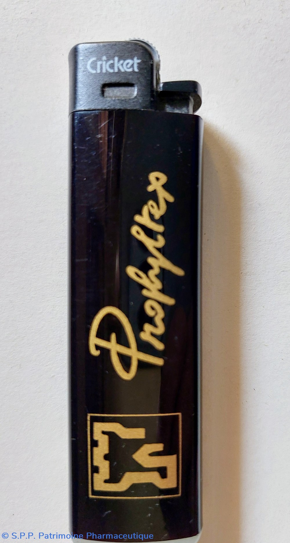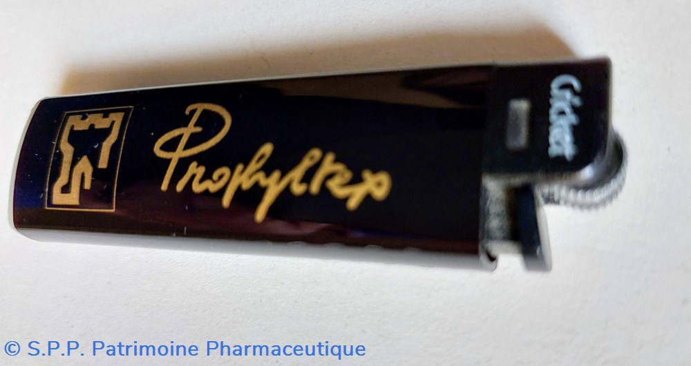 Briquet à gaz de marque Cricket de couleur noire marqué " PROPHYLTEX" ( Fournisseur de préservatifs)