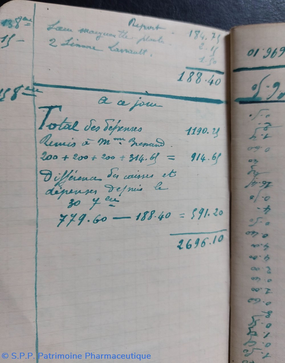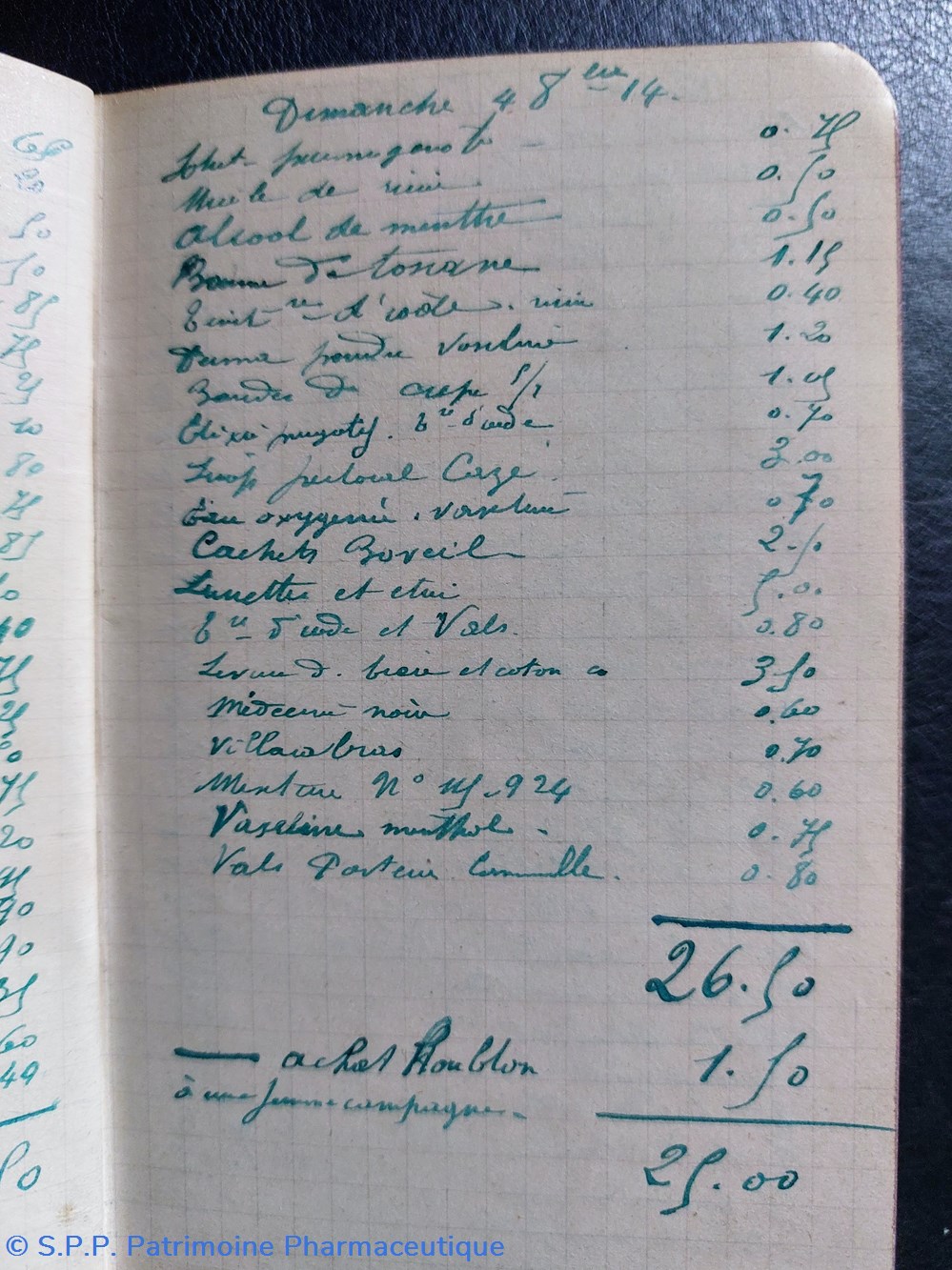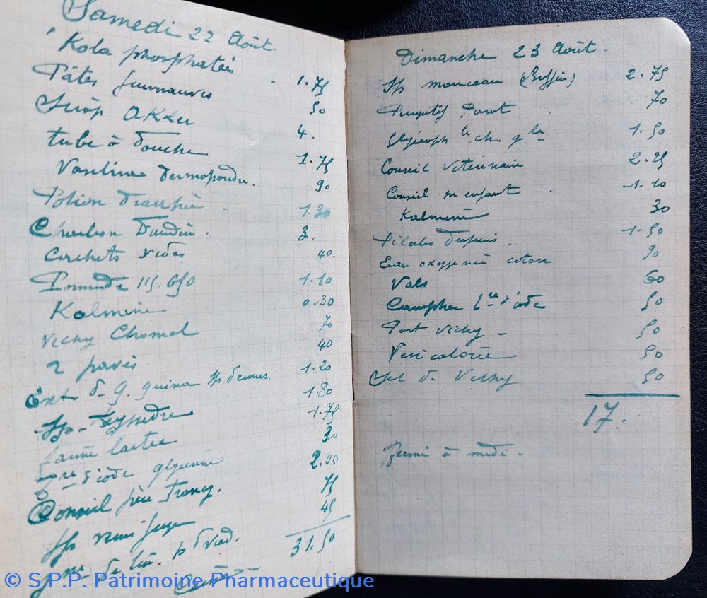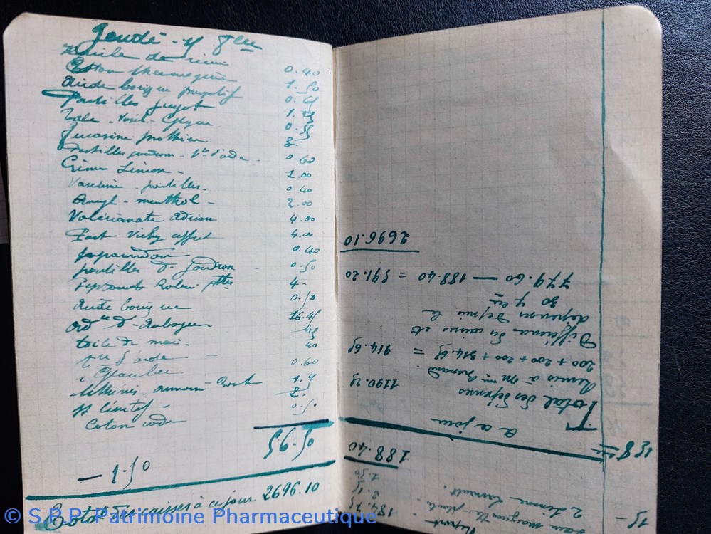 On trouve également la comptabilité de produits pharmaceutiques : Aspirine, Acide borique purgatif, Pastilles, crème Valerianate, Elixir purgatif, Vaseline, coton,baume,Kola phosphaté,Vichy....