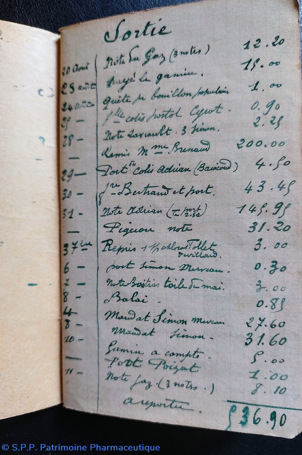 Parmi les écritures on trouve des notes plus personnelles exemple " Problème de gaz" ou "passera à la gare pour un mandat" le 8 7bre une sortie d'argent de 0.88 pour l'achat d'un balai.