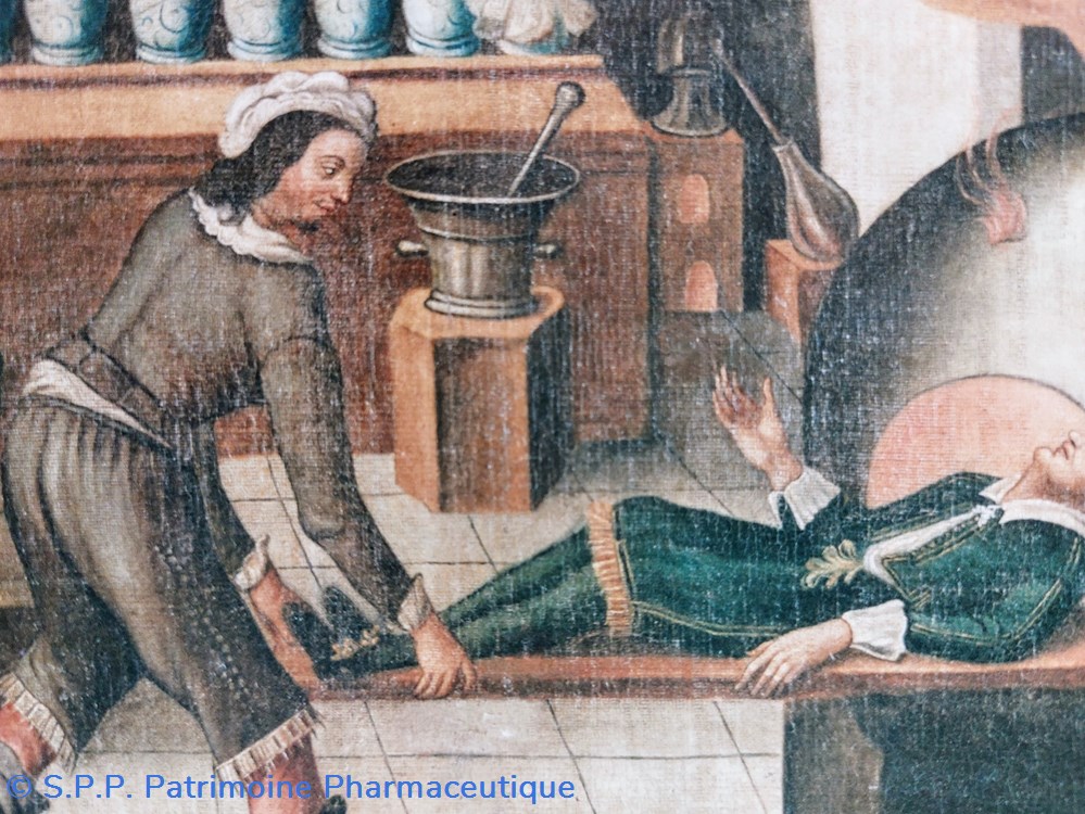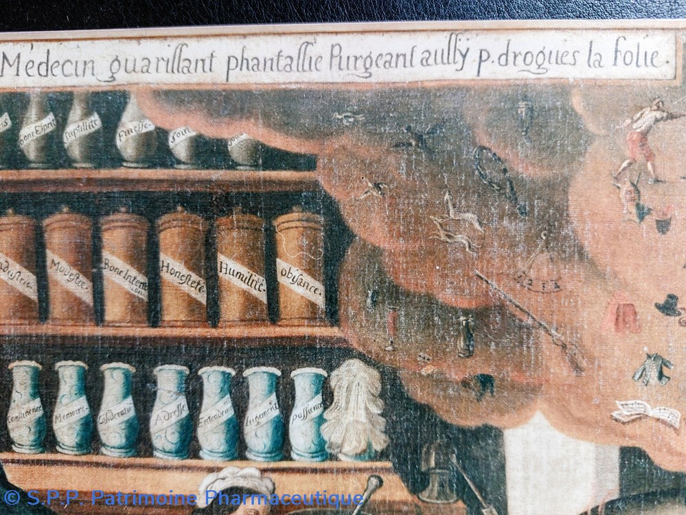 C'est un document significatif des pratiques de charlatanisme qui nous renseigne sur la disposition intérieure d'une officine dont les vases, soigneusement rangés , signalent des contenus plus allégoriques qu'efficaces.