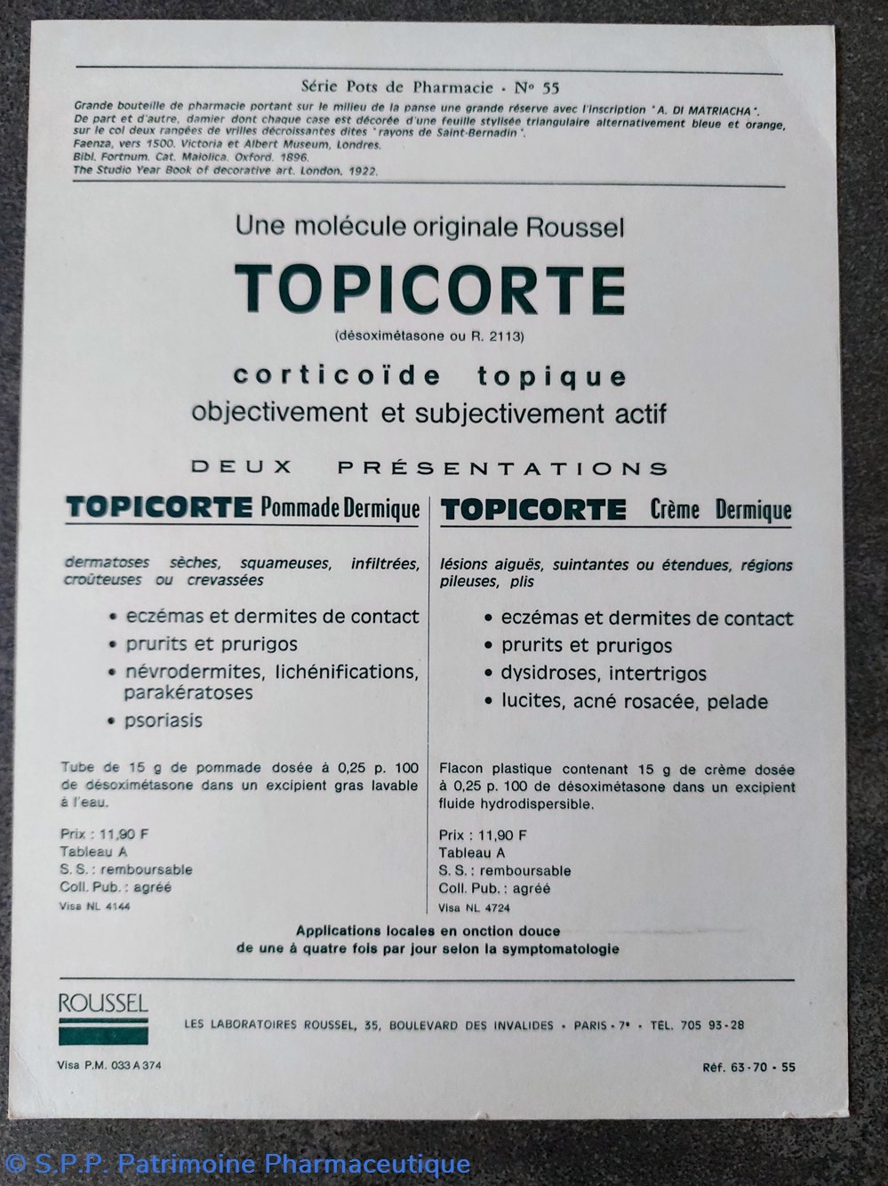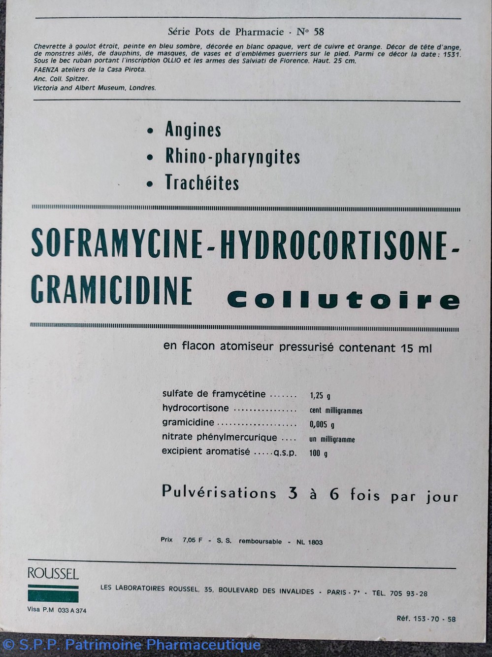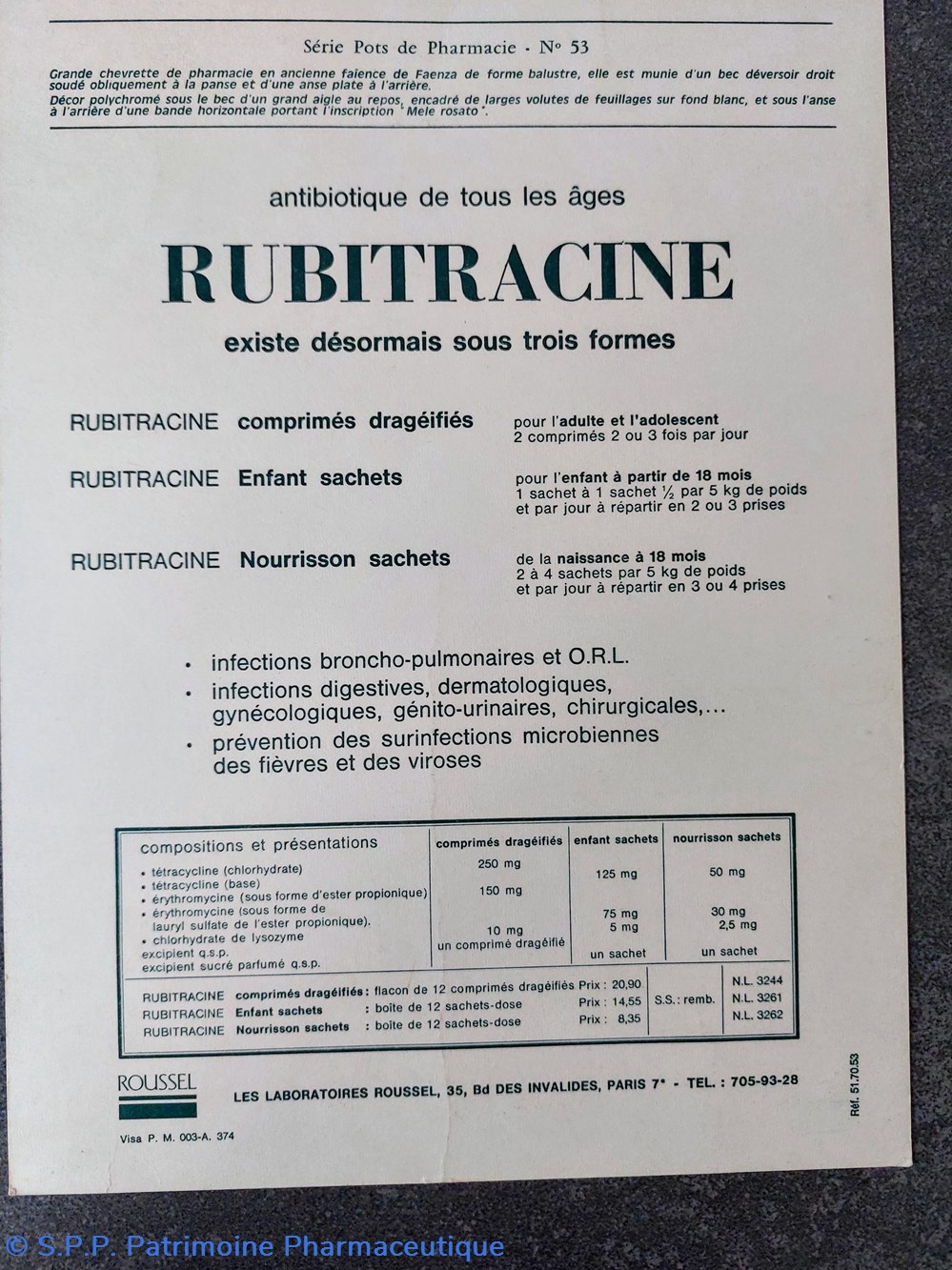 Au VERSO : Désignation précise des vases et présentation d'un ou plusieurs produits des Laboratoires ROUSSEL avec indications et formules. Parmi les produits :