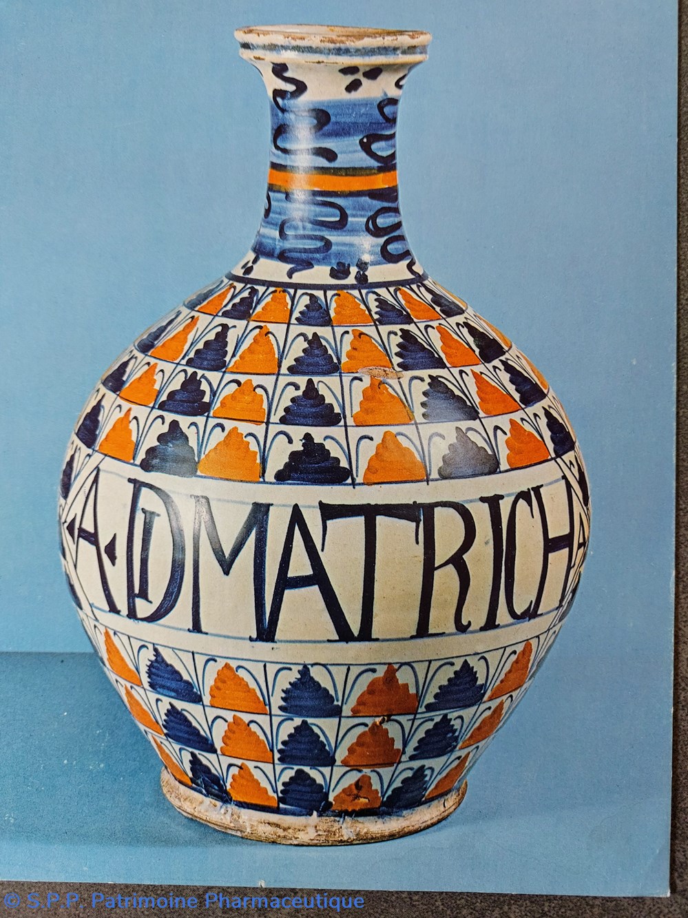 Au RECTO : Grande bouteille de Pharmacie Inscription " A. Di MATRIACHA" Faenza vers 1500