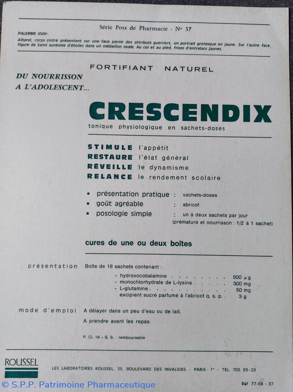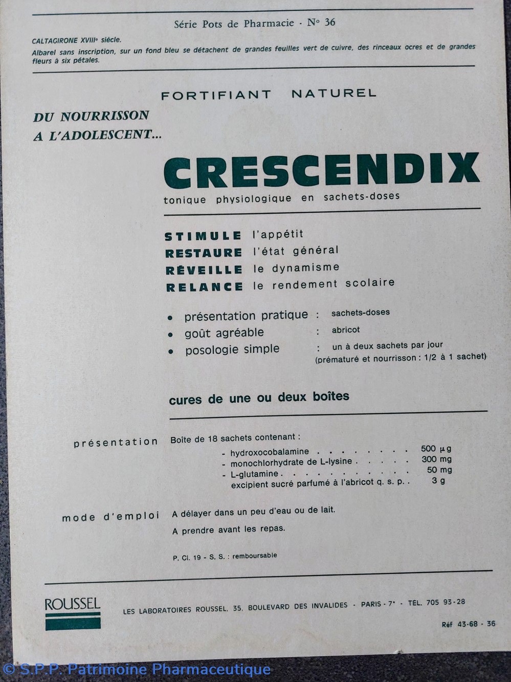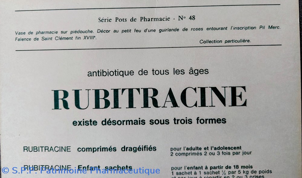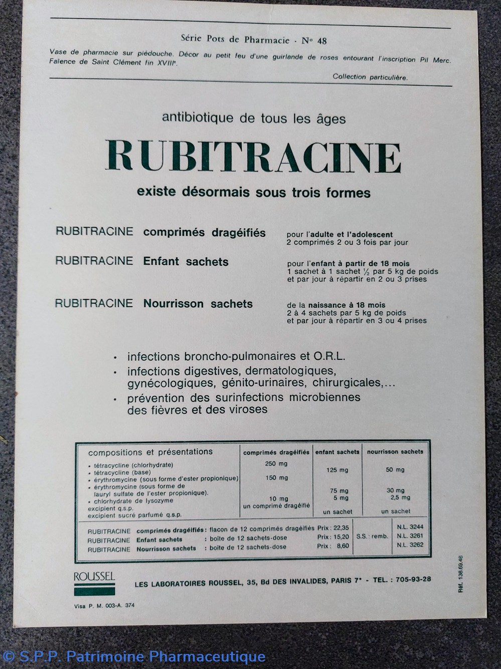 Au VERSO : Désignation précise des vases et présentation d'un ou plusieurs produits des Laboratoires ROUSSEL avec indications et formules. Parmi les produits :