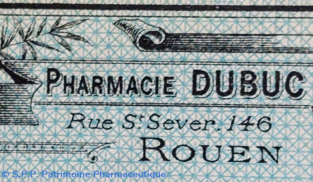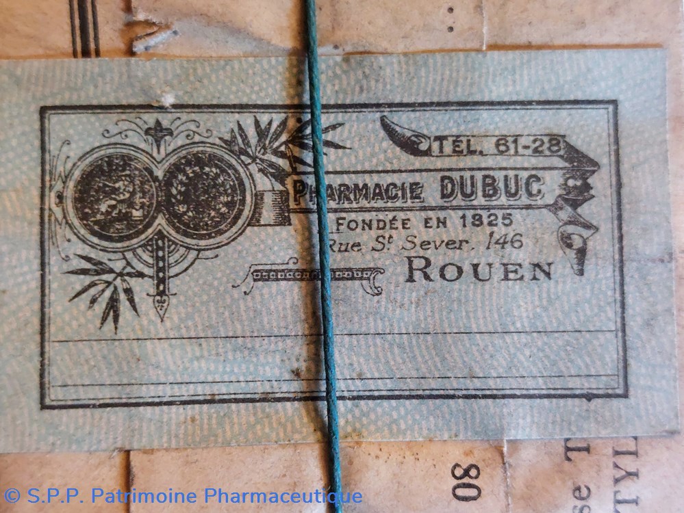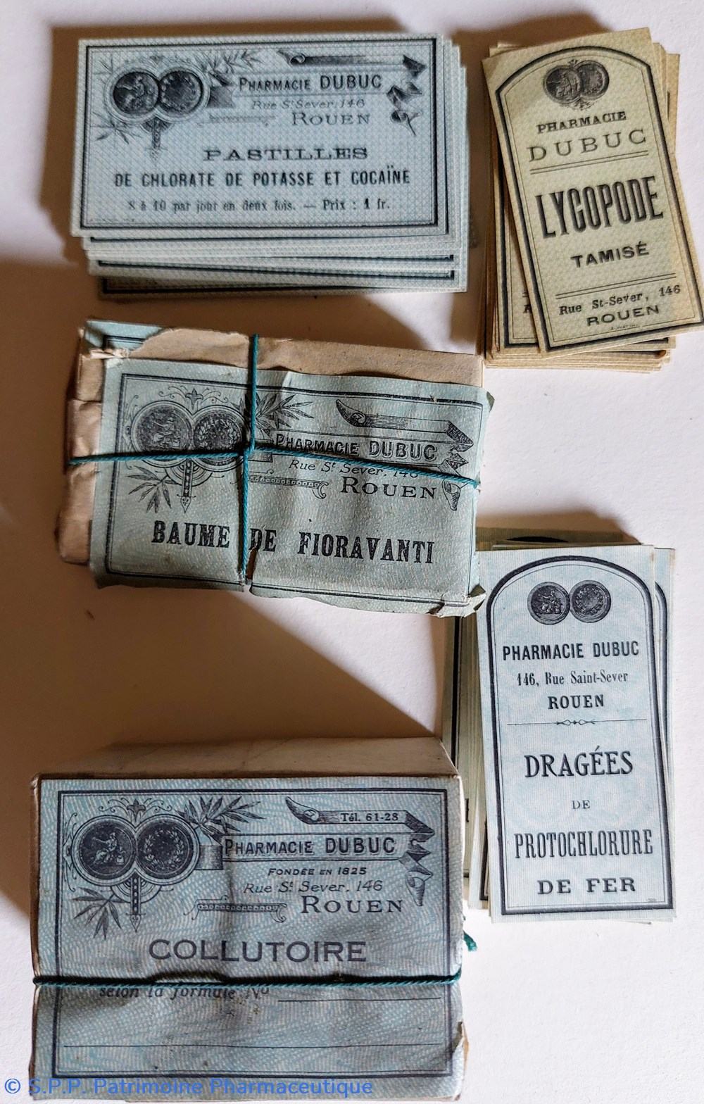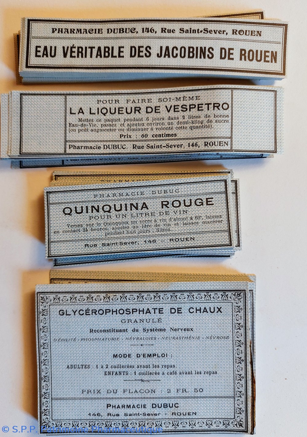 La Pharmacie DUBUC à Rouen commercialisait ses propres remèdes et faisait imprimer d'une part des étiquettes sans destination précise et, d'autre part, des étiquettes pour des productions spécifiques. On trouve ainsi une dizaine d'étiquettes de format et de destinations différentes.