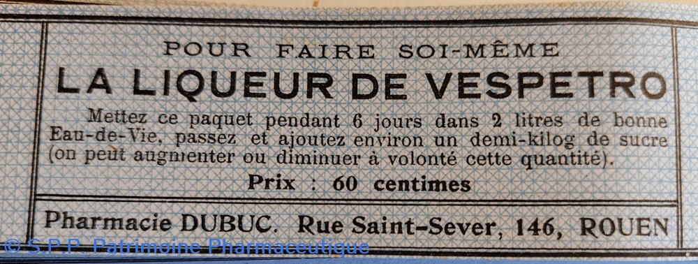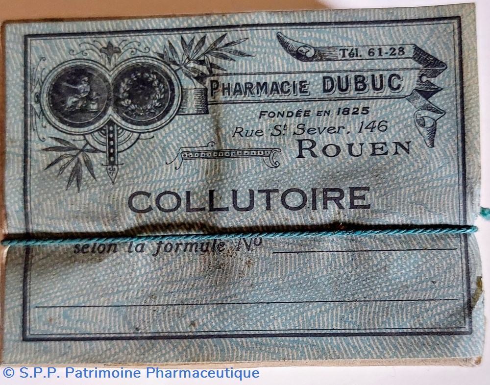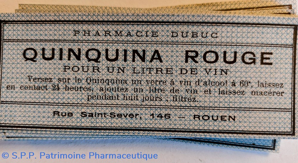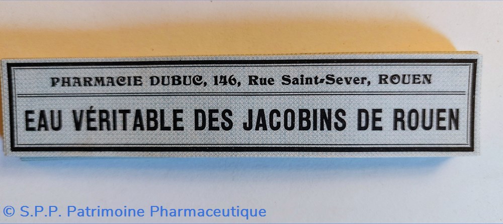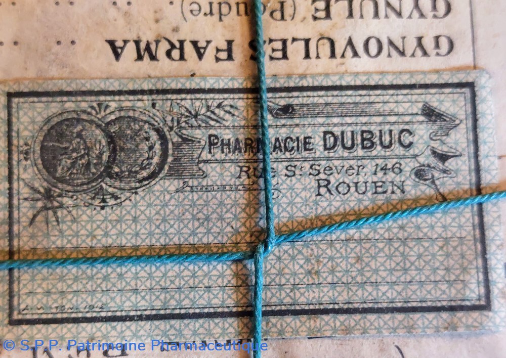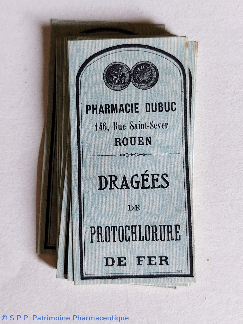 La Pharmacie DUBUC à Rouen commercialisait ses propres remèdes et faisait imprimer d'une part des étiquettes sans destination précise et, d'autre part, des étiquettes pour des productions spécifiques. On trouve ainsi une dizaine d'étiquettes de format et de destinations différentes.