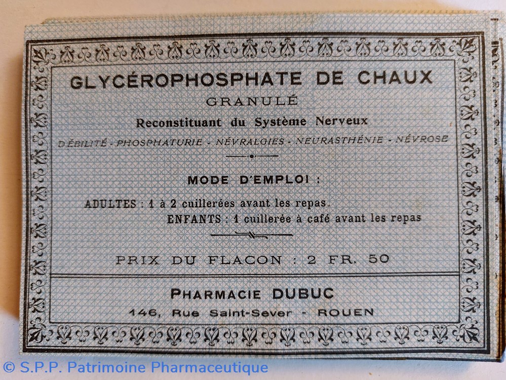 - GLYCÉROPHOSPHATE de CHAUX ( Granulés Reconstituant du système nerveux) Prix 2 fr 50.
