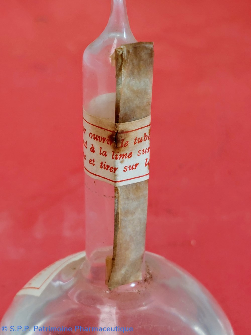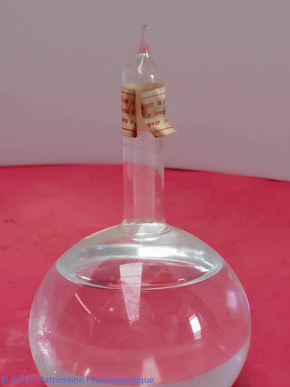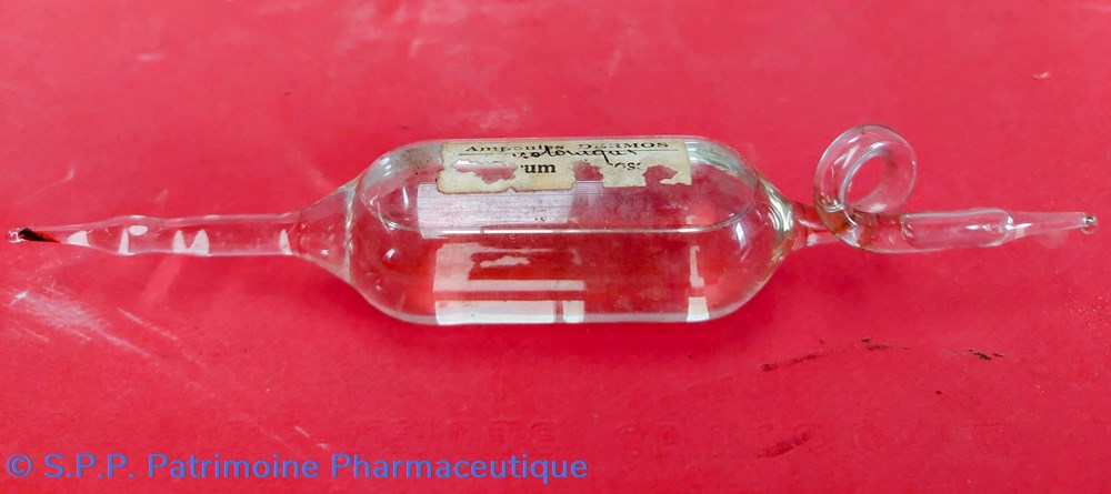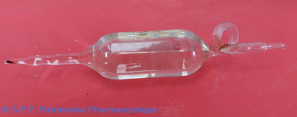 Ampoule en verre en forme de petite bonbonne sphérique prolongée d'un tube formant l'ampoule à scier comme les ampoules de médicaments courants.