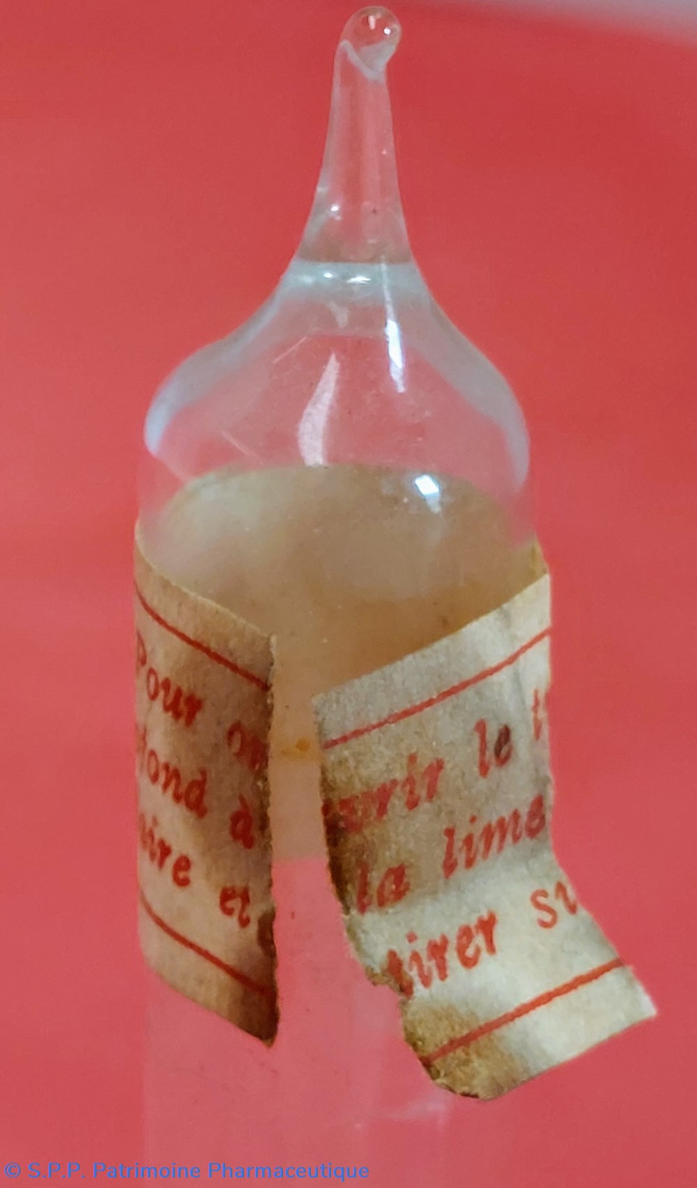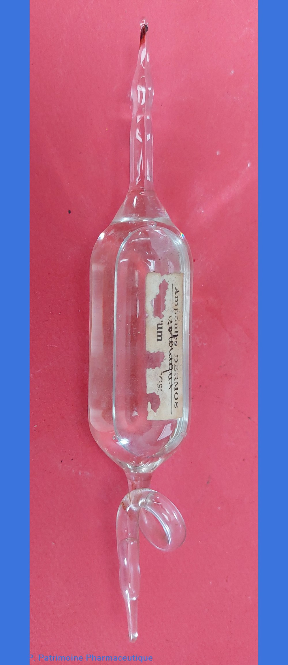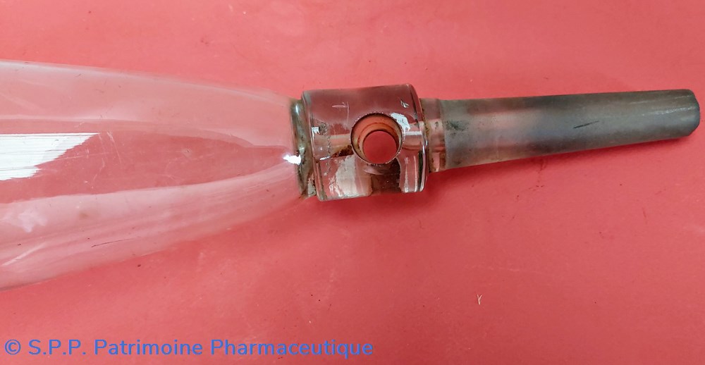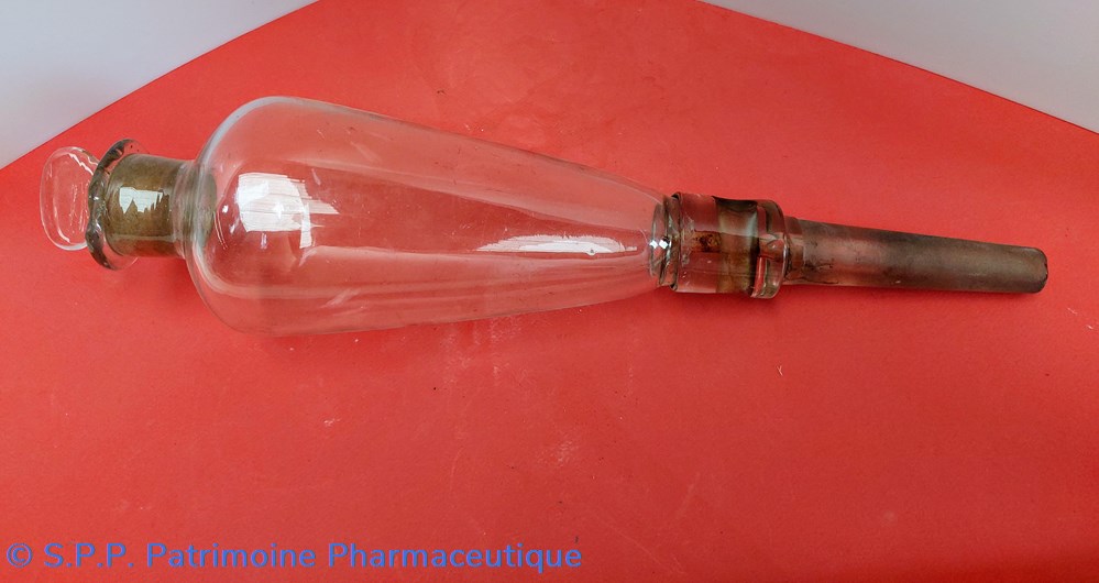 Ampoule de forme originale avec torsadé en verre permettant d'être fixée lors de la perfusion.