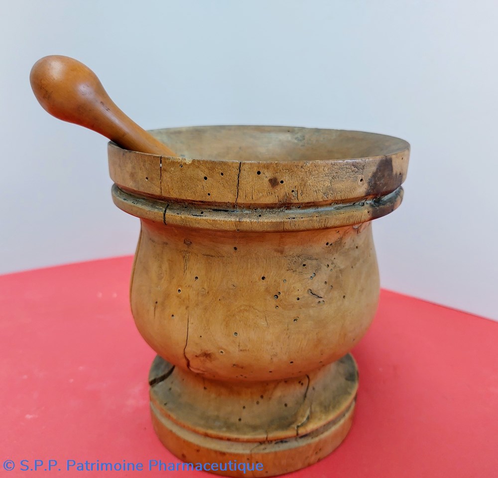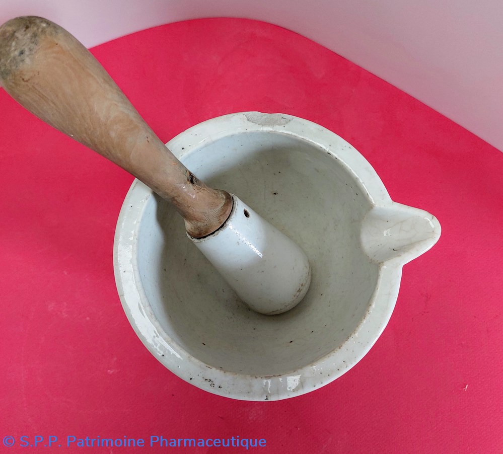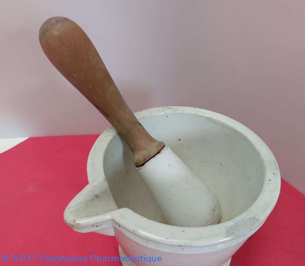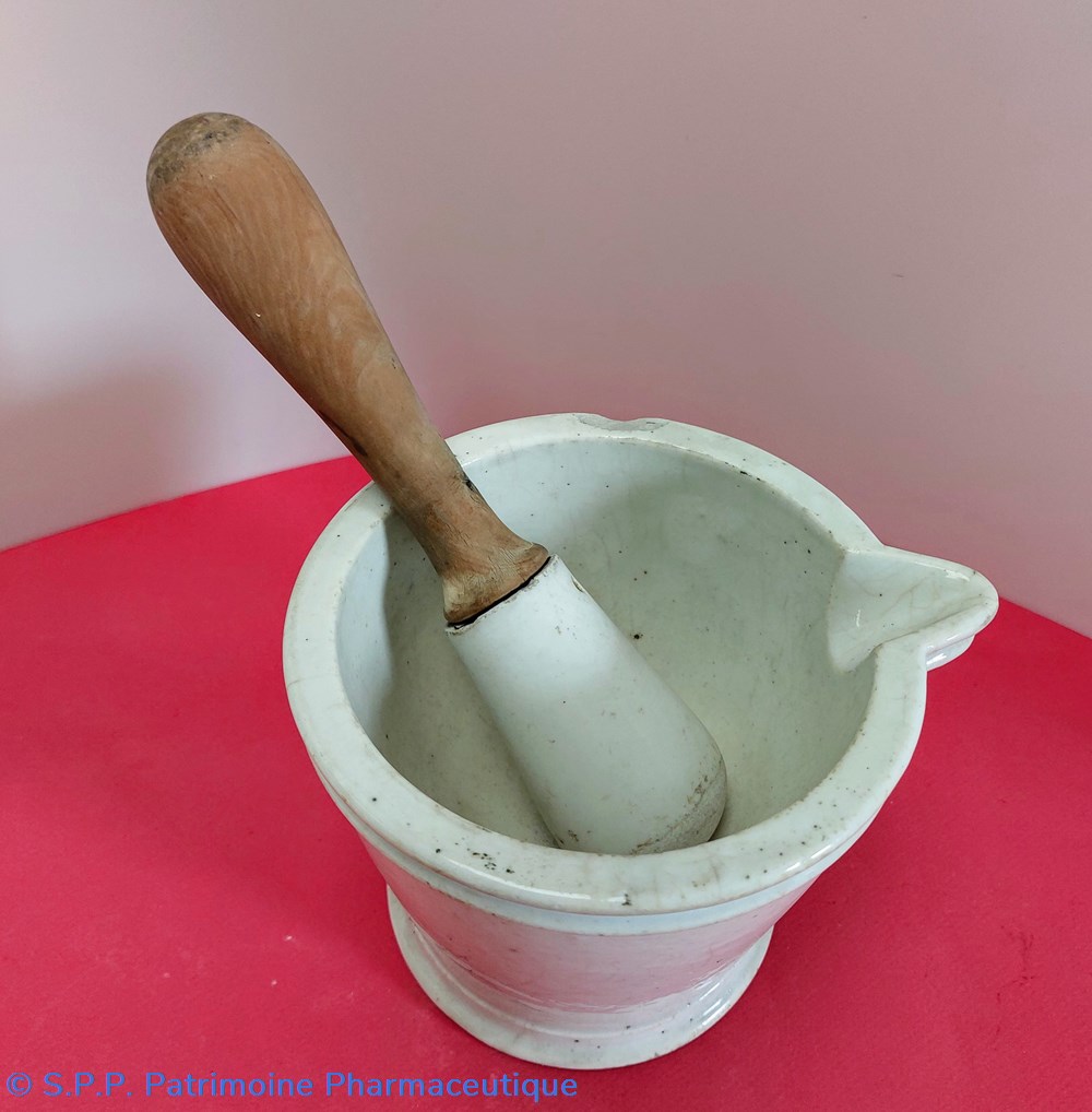 Le pharmacien utilisait un mortier et son pilon pour piler, broyer ou homogénéiser divers produits de la pharmacopée en vue de préparations pharmaceutiques.