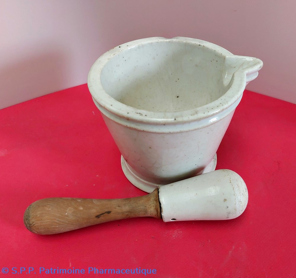 Mortier en faïence blanche de forme tronc conique inversée avec bec verseur et avec son pilon