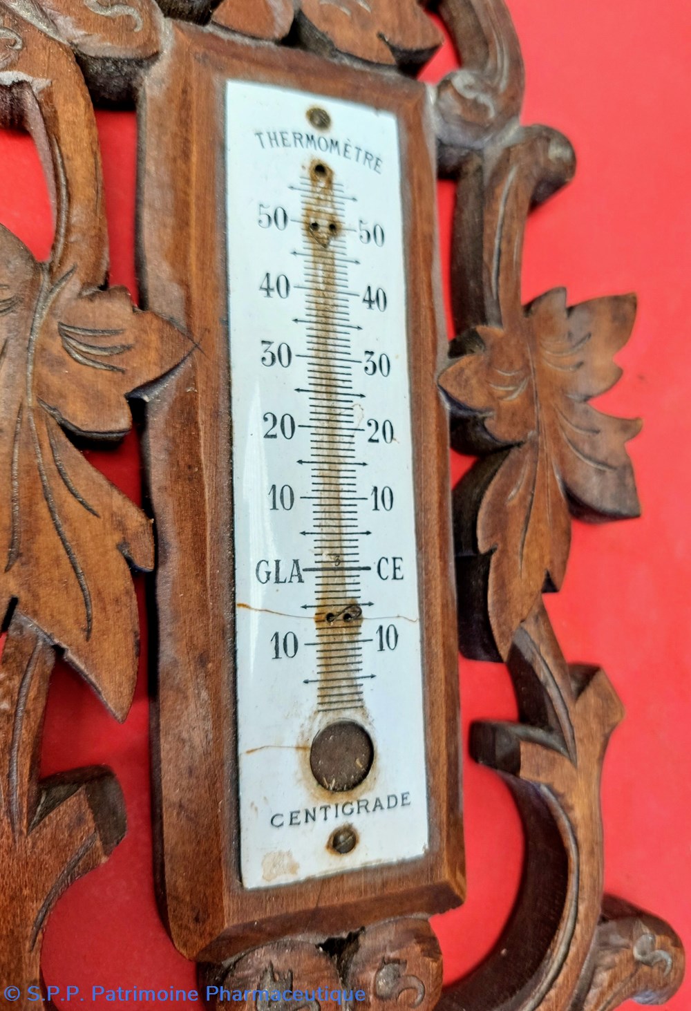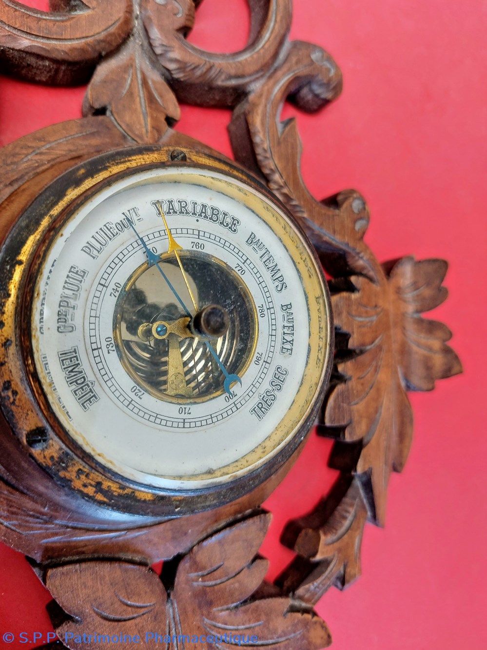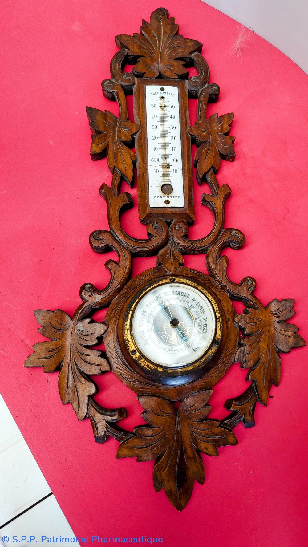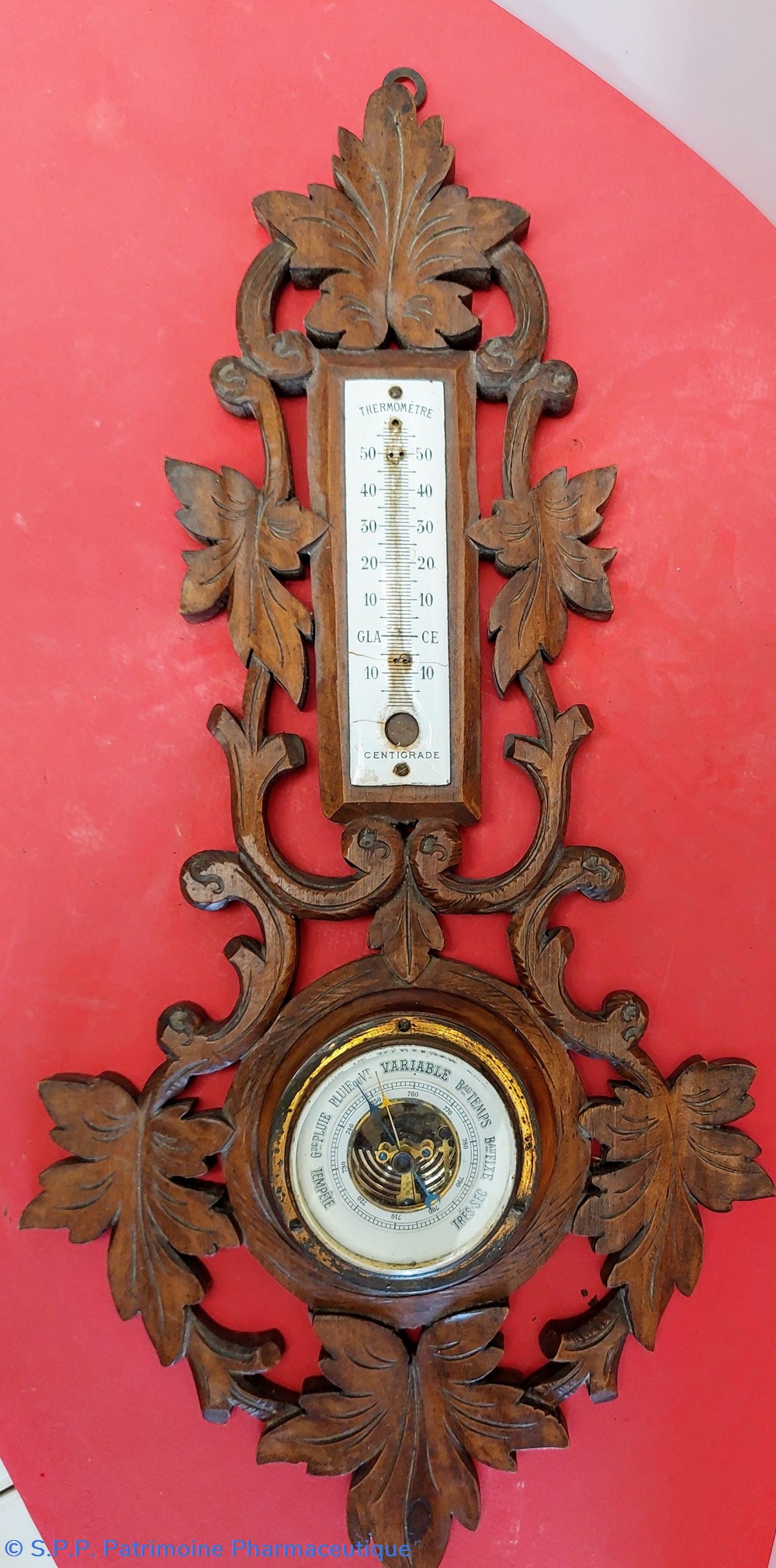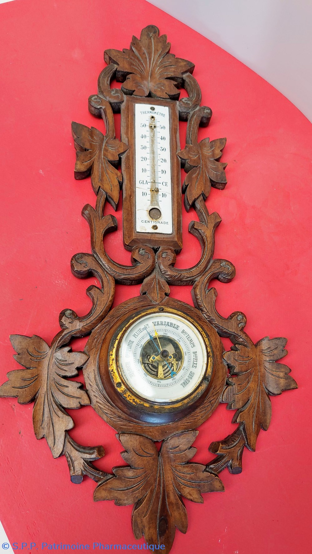 Sur un support en bois décoré de feuillage, un thermomètre et un baromètre servant de décor mural dans les pharmacies et permettant d'informer la clientèle sur l'ambiance climatique.