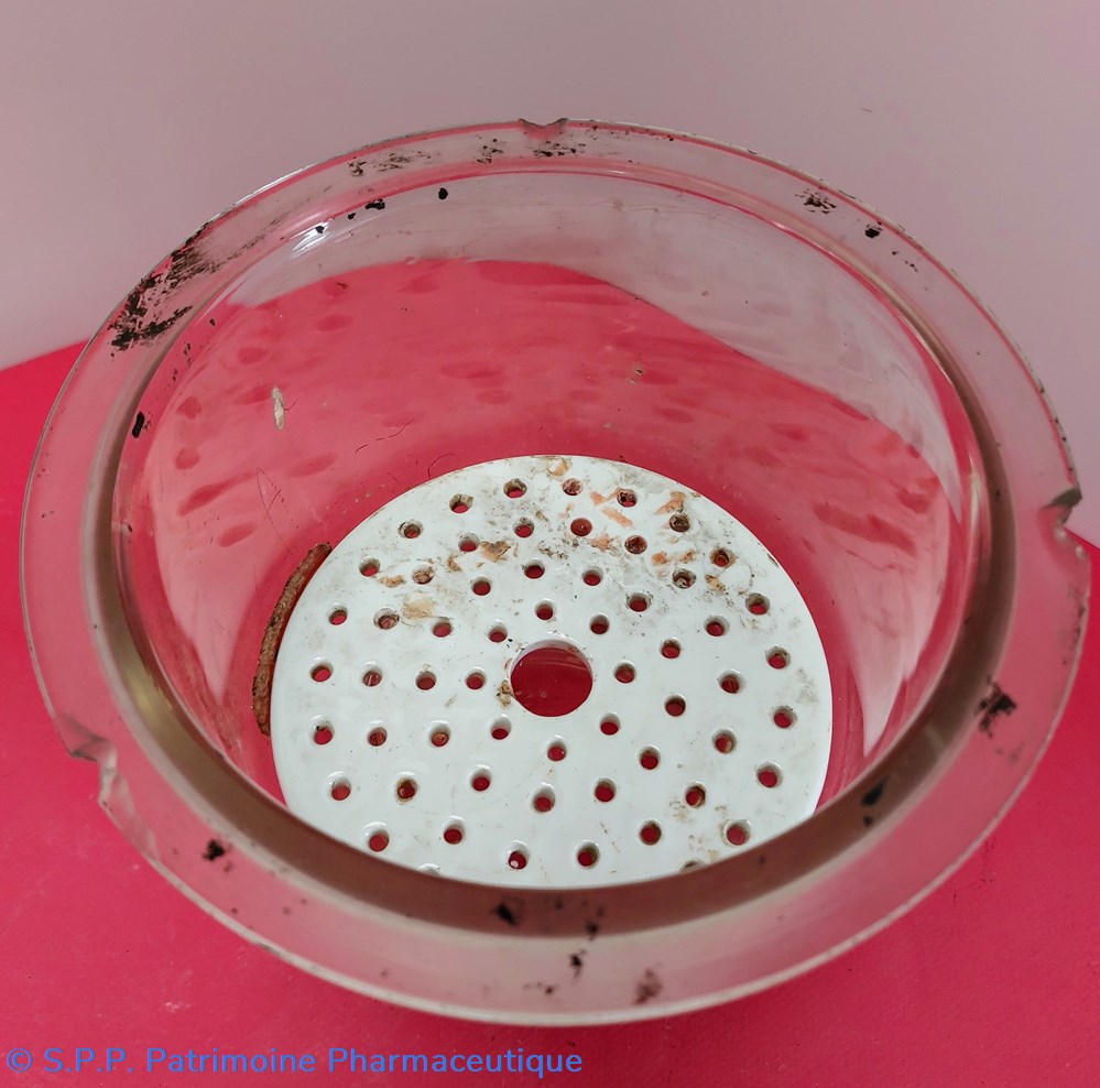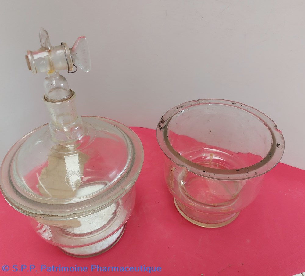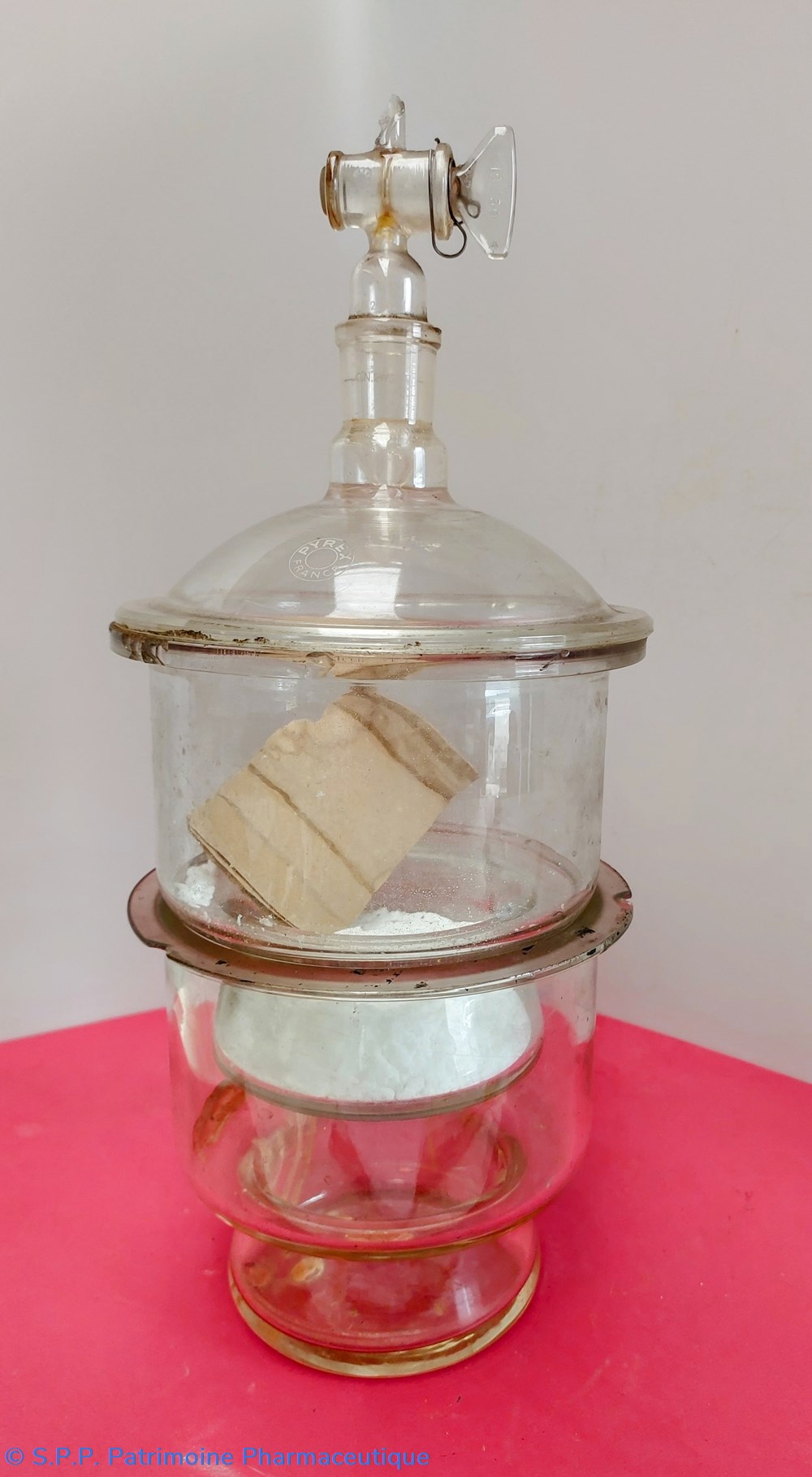 Dessicateur en verre à robinet avec plaque perforée de dessication en porcelaine.