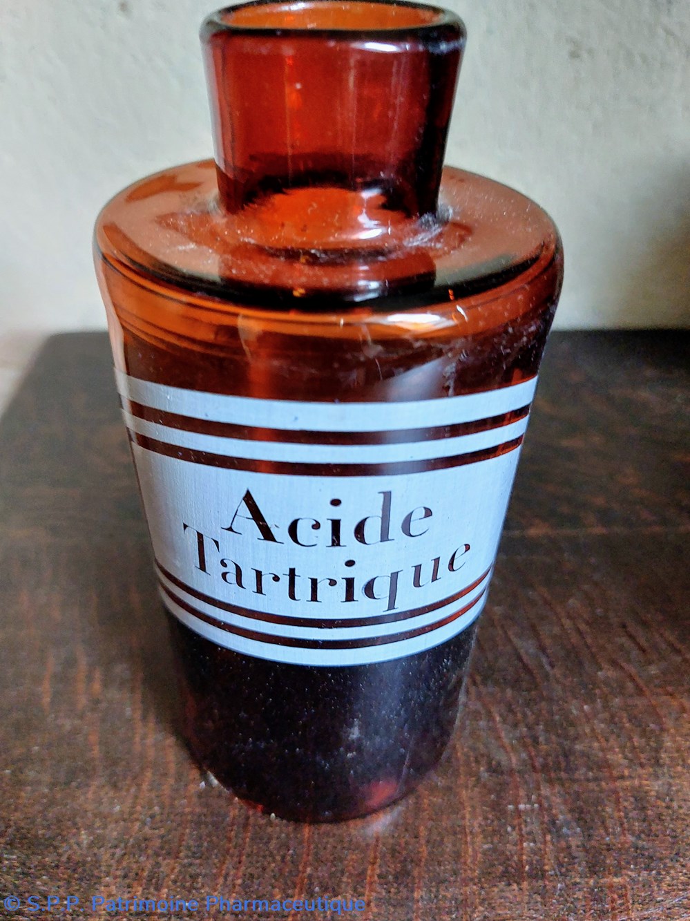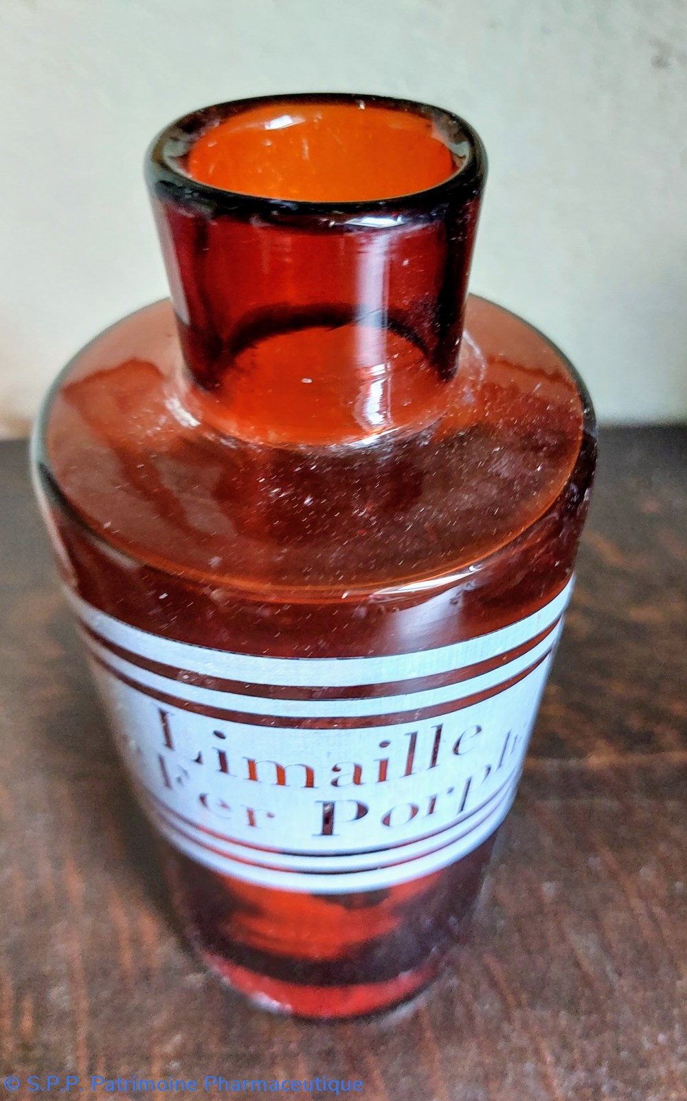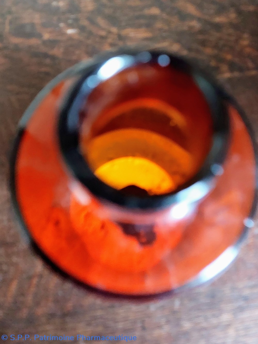 Bouteille (vide) ancienne de pharmacie en verre ambré. Forme cylindrique