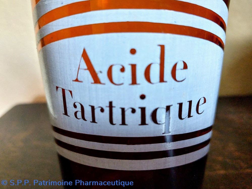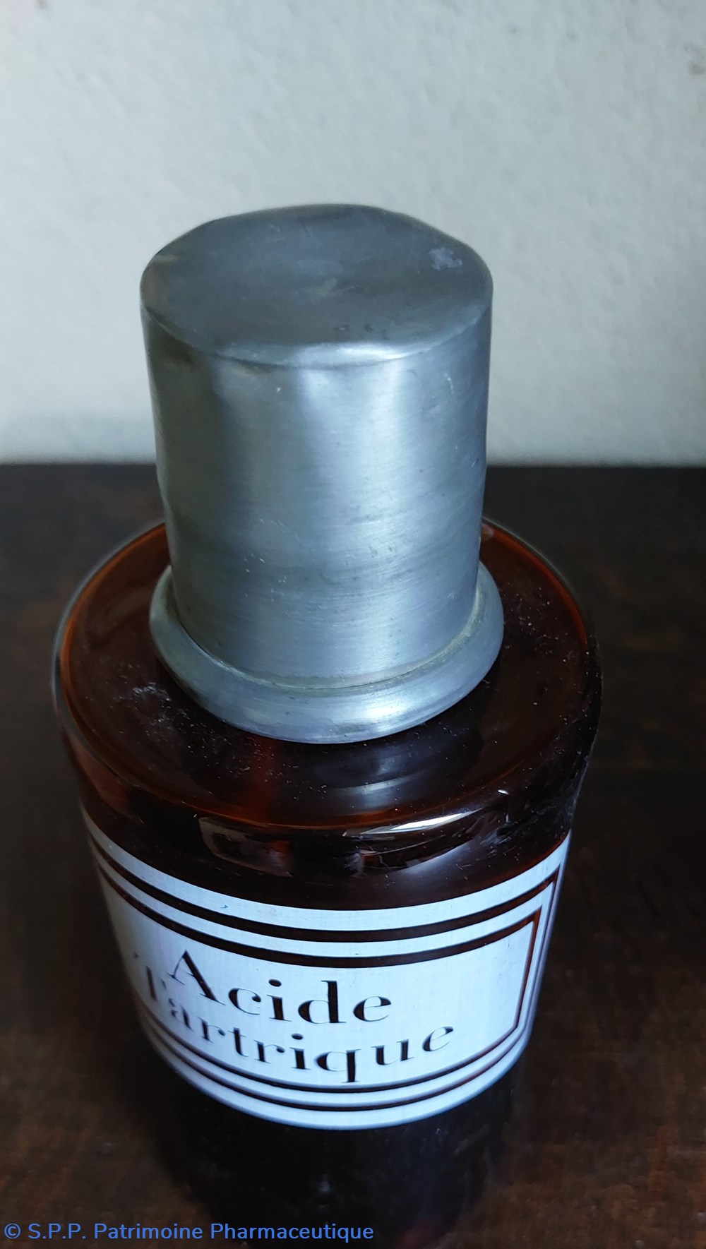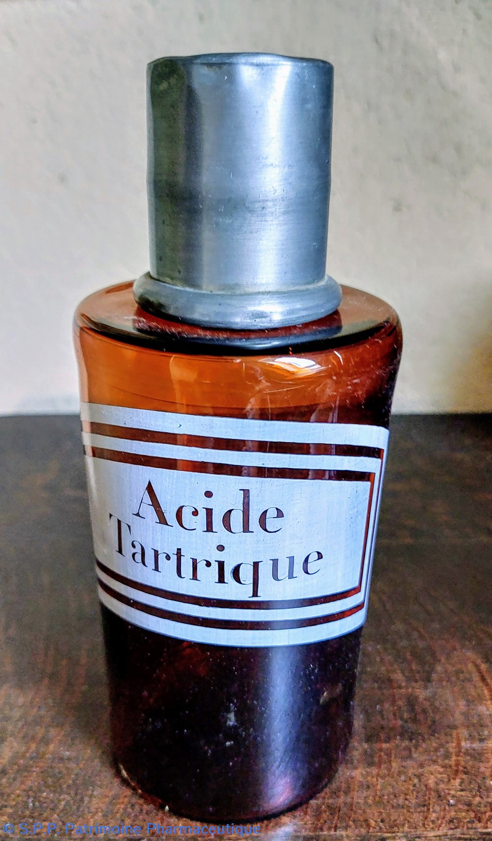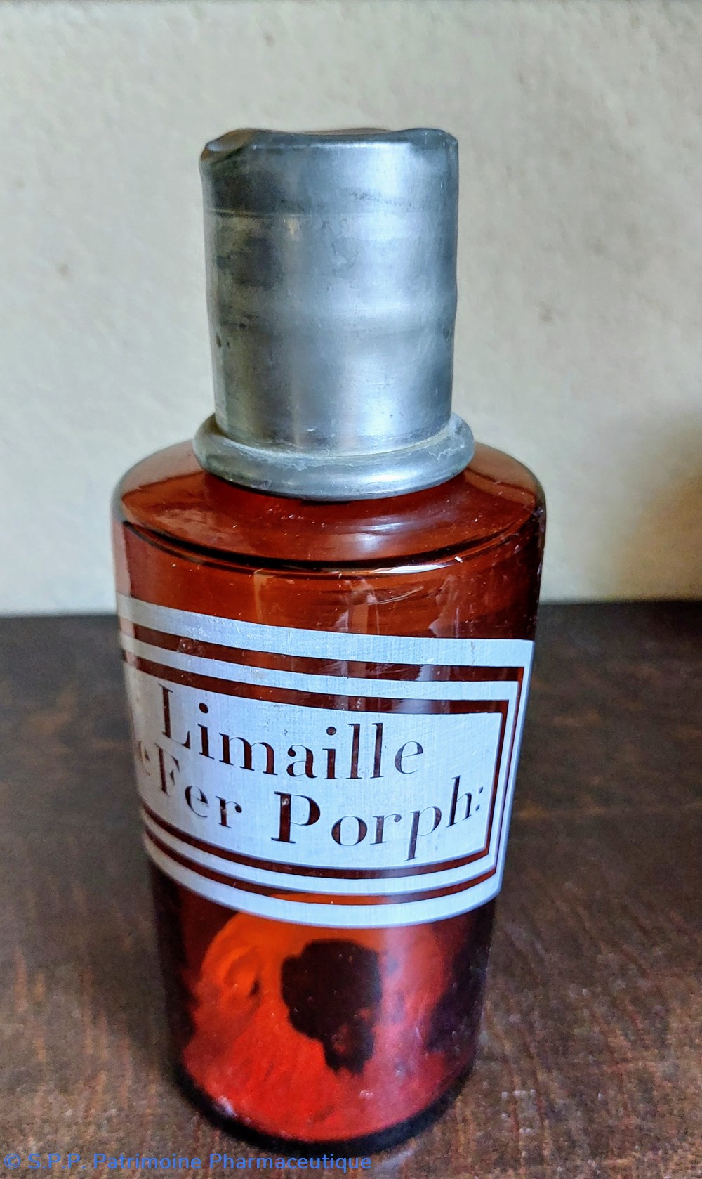 Bouteille (vide) ancienne de pharmacie en verre ambré. Forme cylindrique