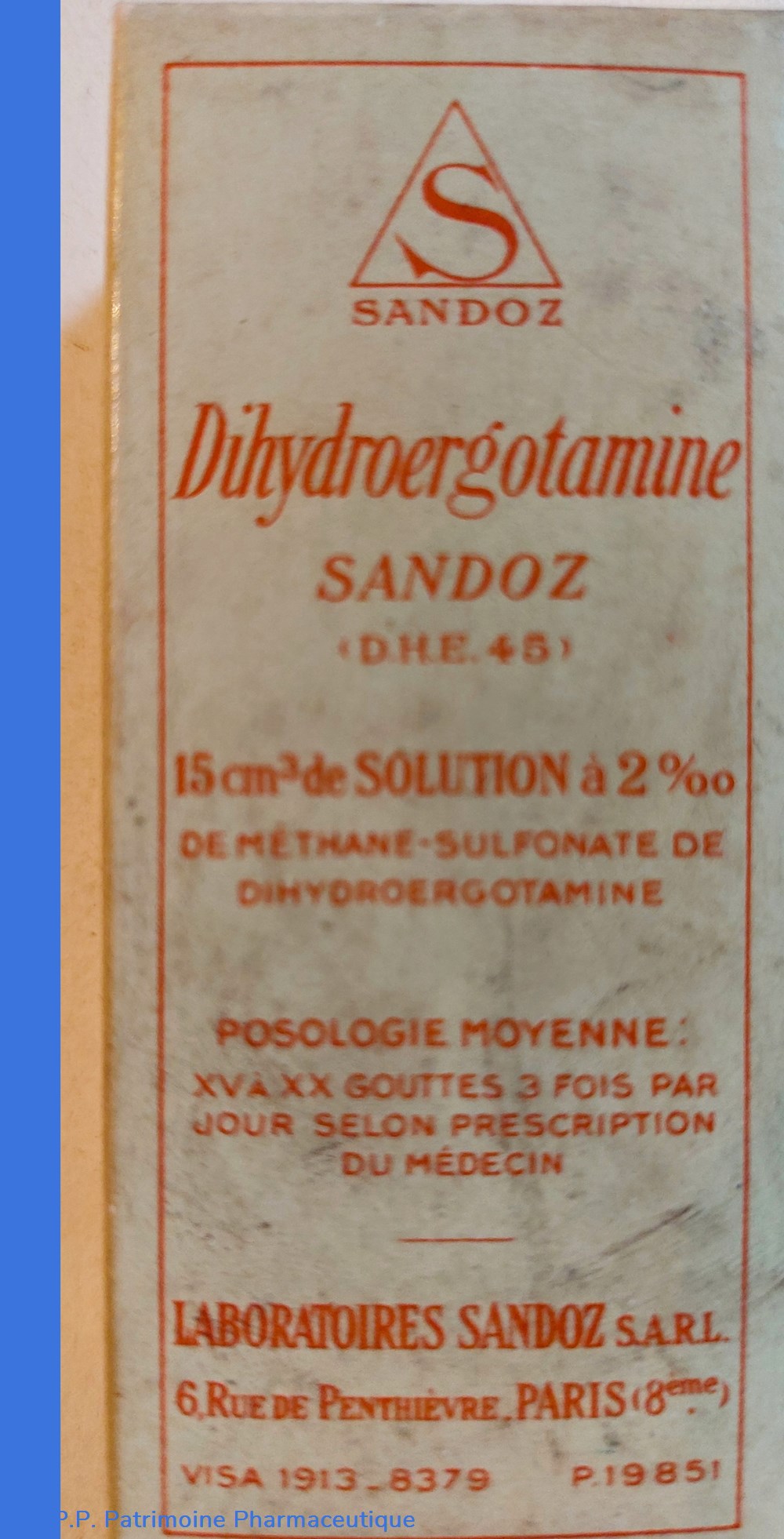 Flacon cacheté à la cire haut de 8 cm contenant 15 cm3 de SOLUTION à 2/00 de Méthane Sulfonate de Dihydroergotamine