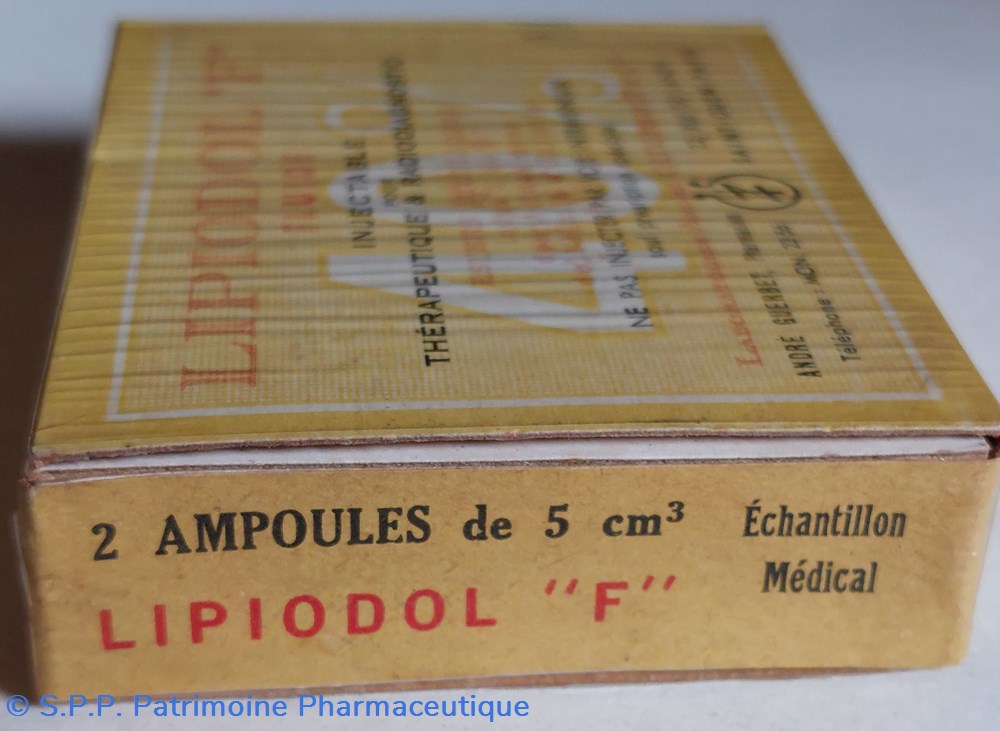 Coffret en carton scellé d'origine de LIPIODOL "F" Fluide Injectable pour thérapeutique et radiodiagnostic. Contient 2 Ampoules de 5 cm3.
