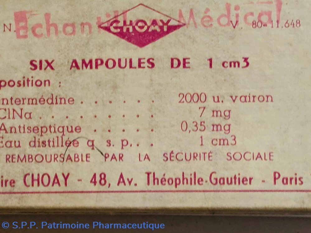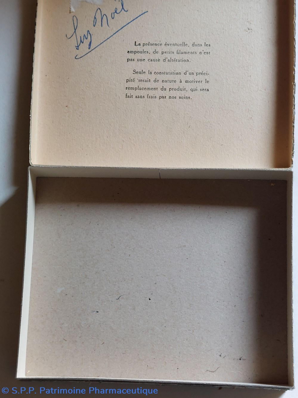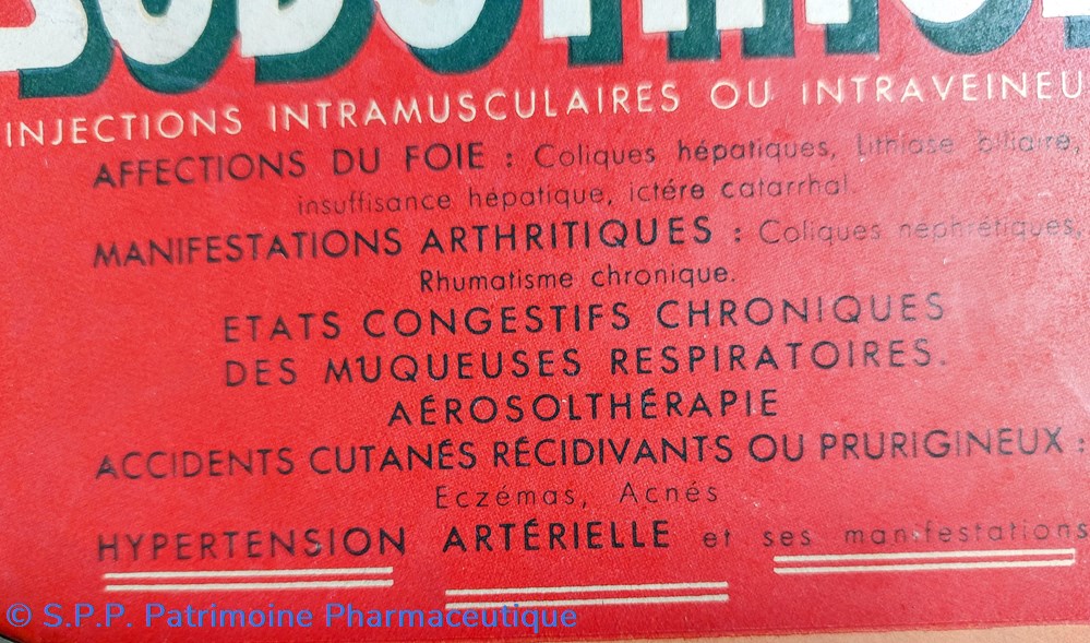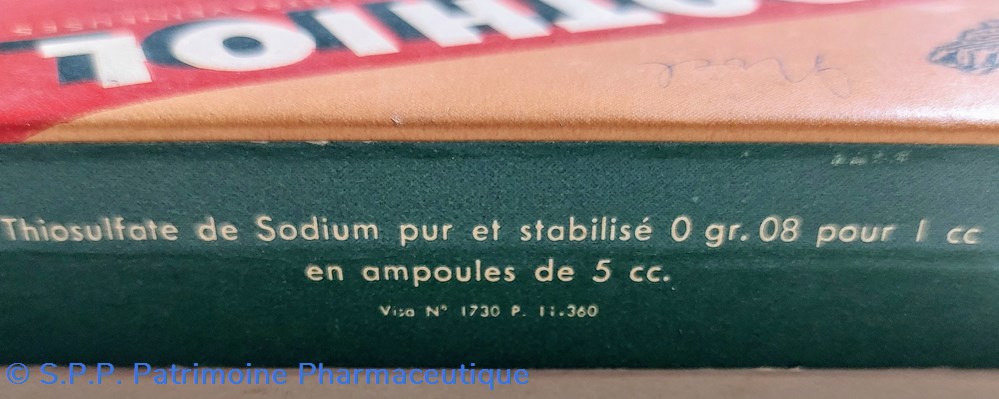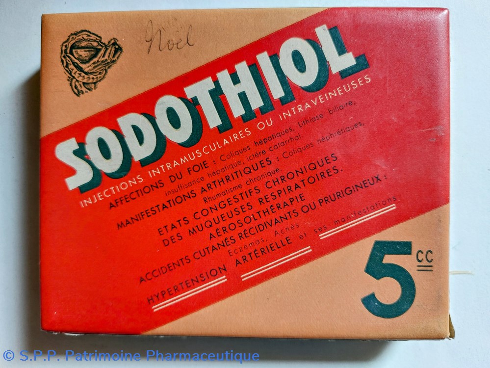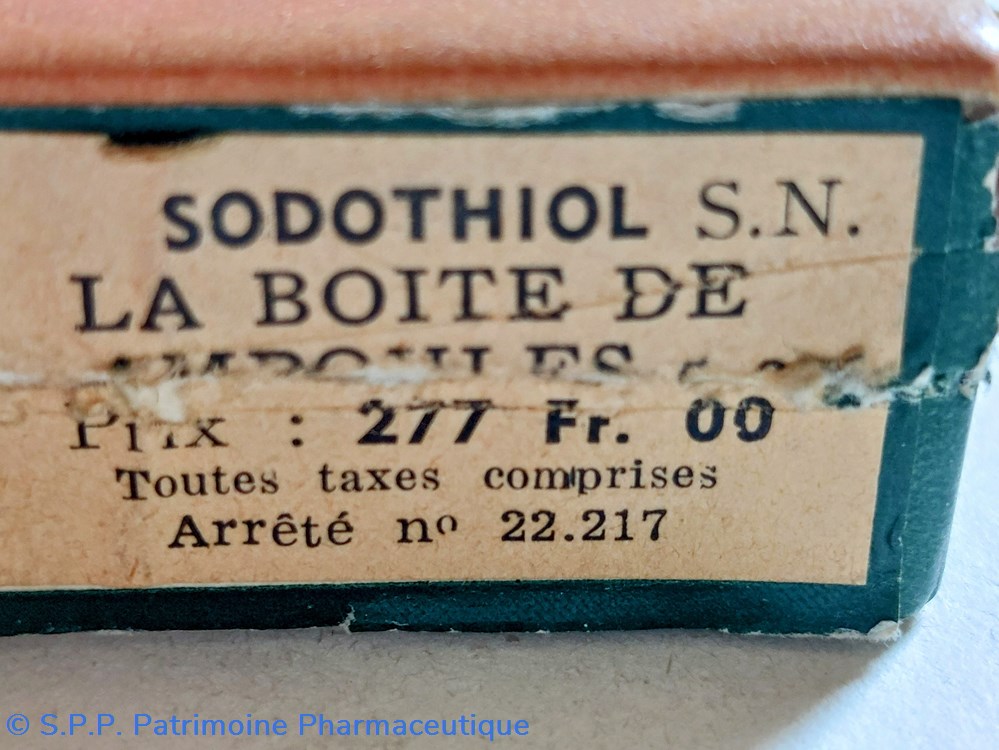 Coffret en carton vide 15* 12*2,5 cm ayant contenu des ampoules de SODOTHIOL pour injections intramusculaires ou intraveineuses.