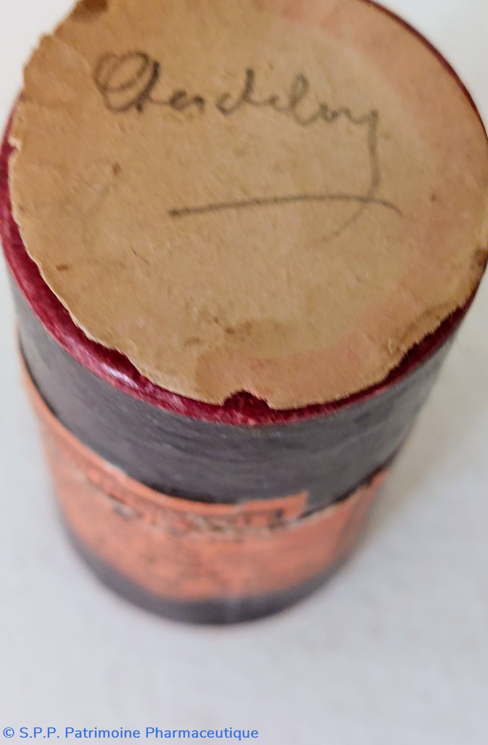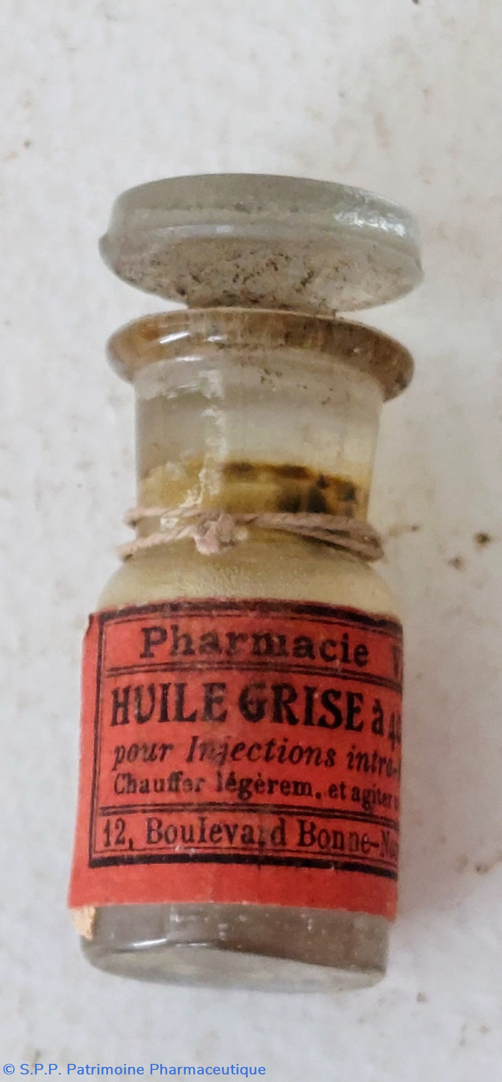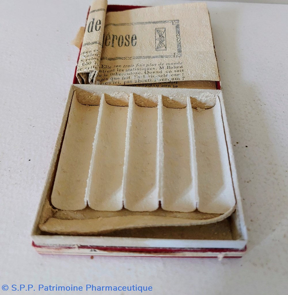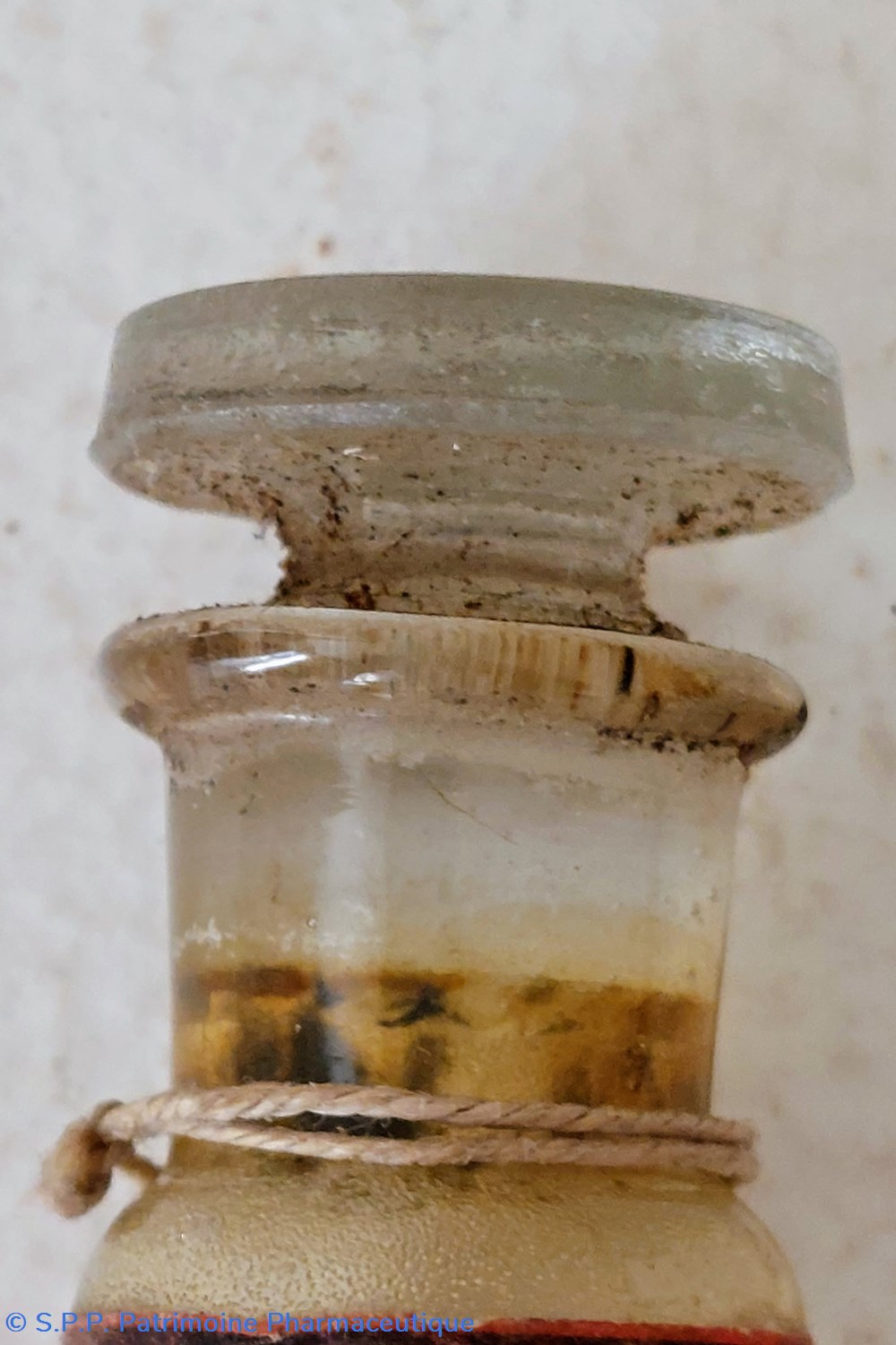 Petit flacon en verre avec traces de produit fermé par un bouchon en verre à l'émeri. Protégé dans un tube en carton