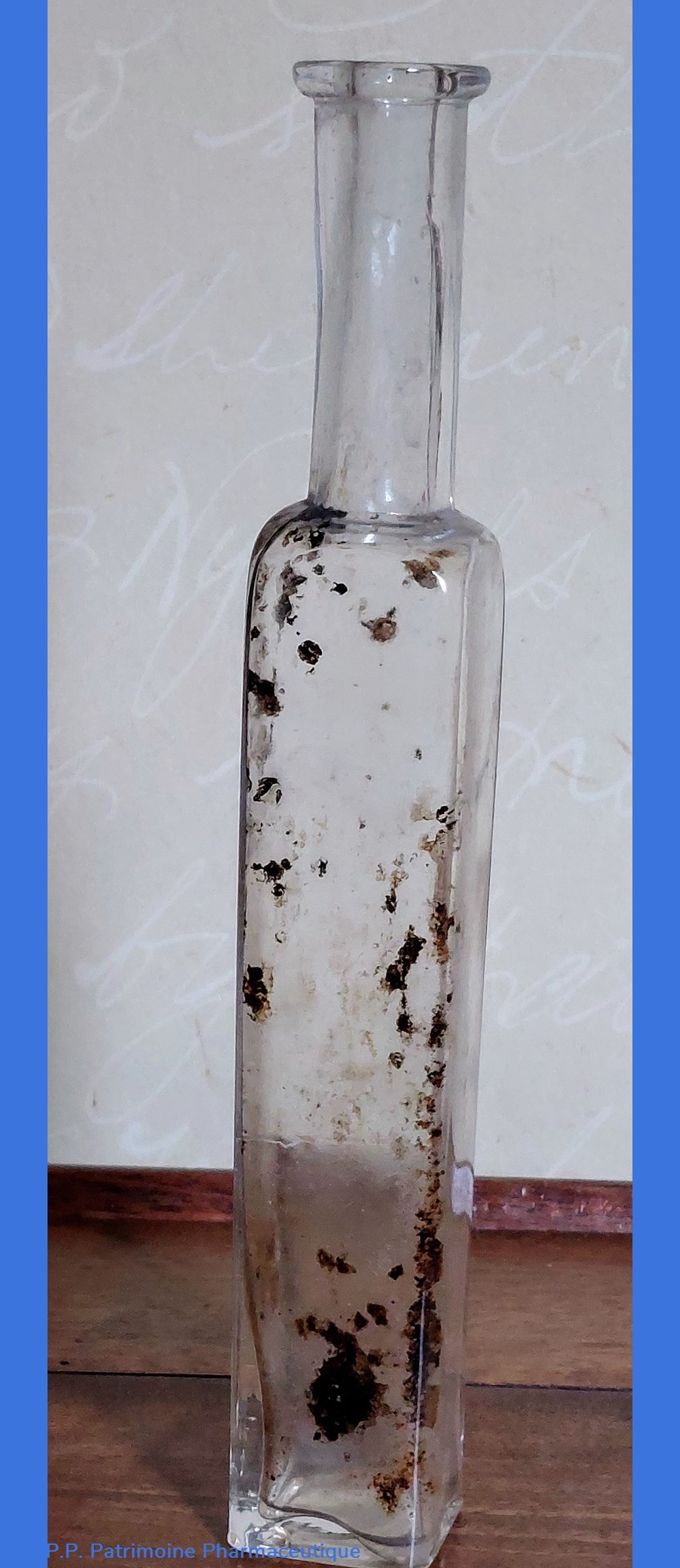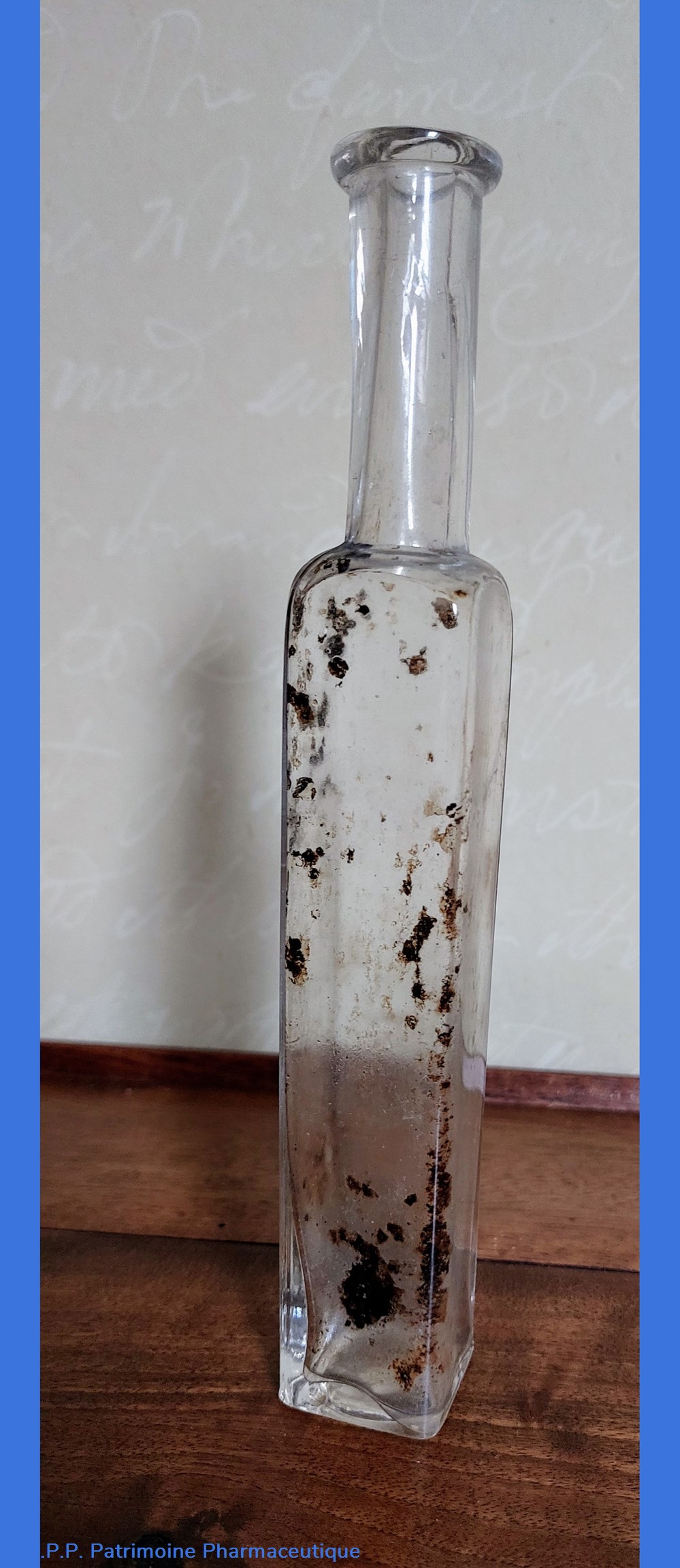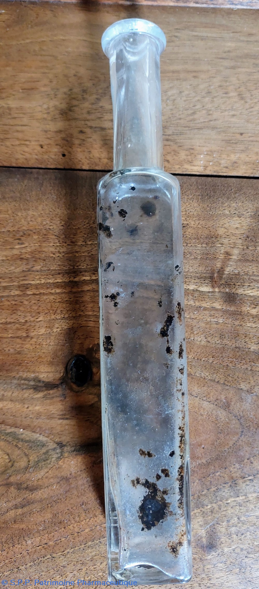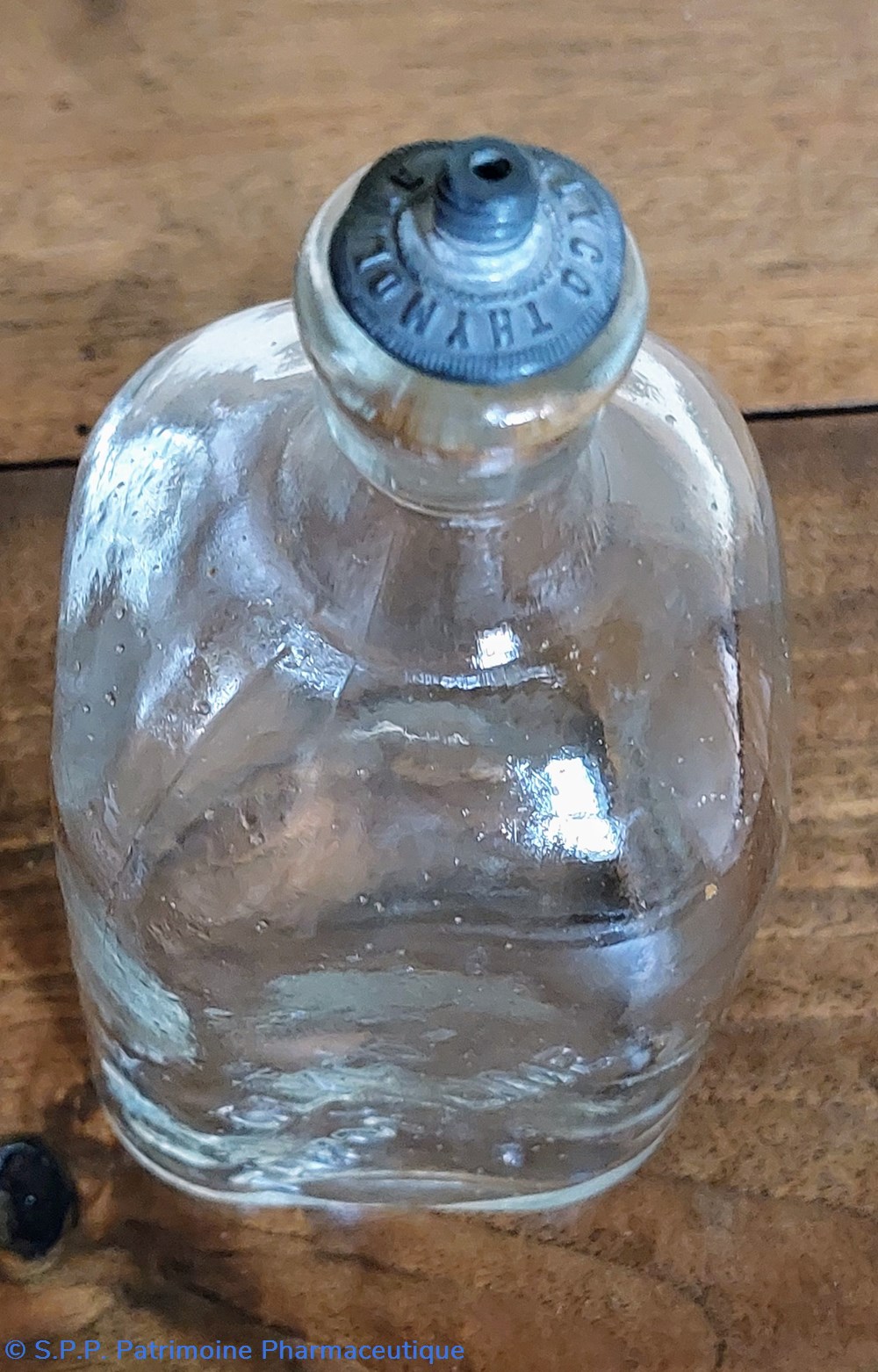Flacon en verre transparent de forme carrée base 6.5*6,5 cm Hauteur 12 cm + 1 cm en métal. Cet embout, est Marqué " Glyco Thymoline" et se termine par un pas de vis qui devait recevoir un mécanisme