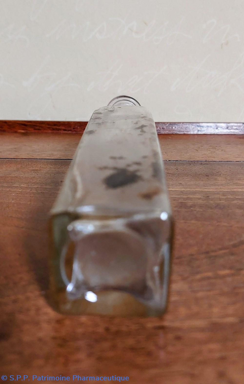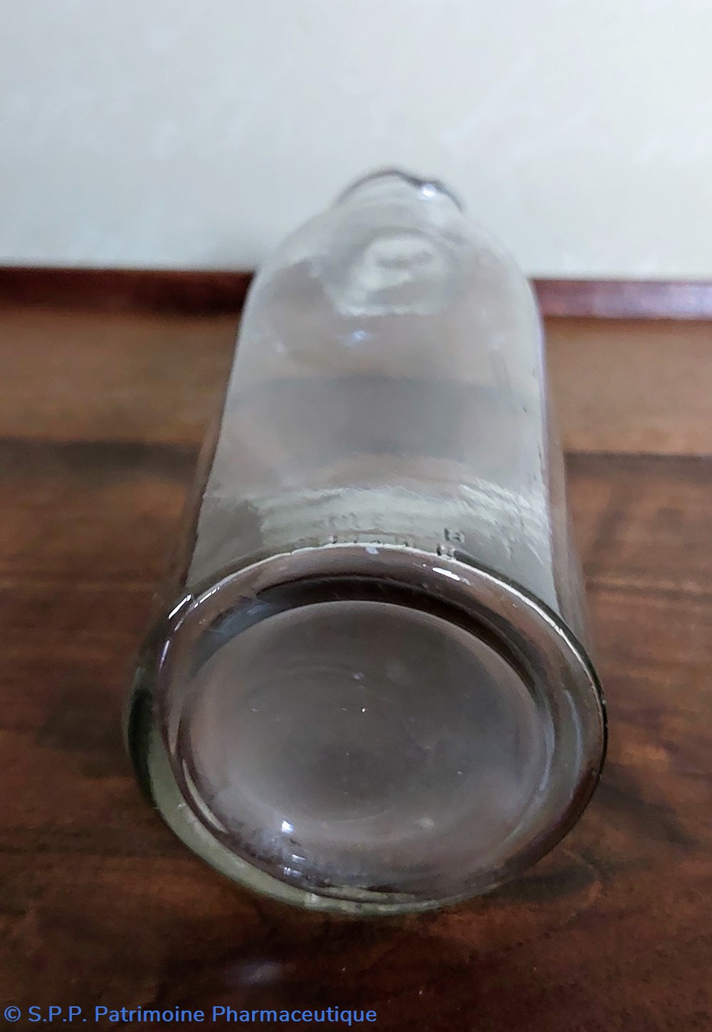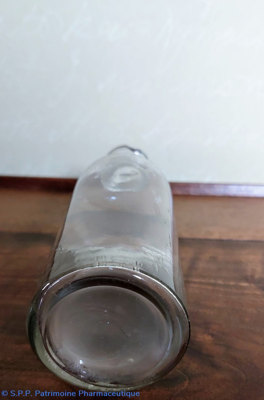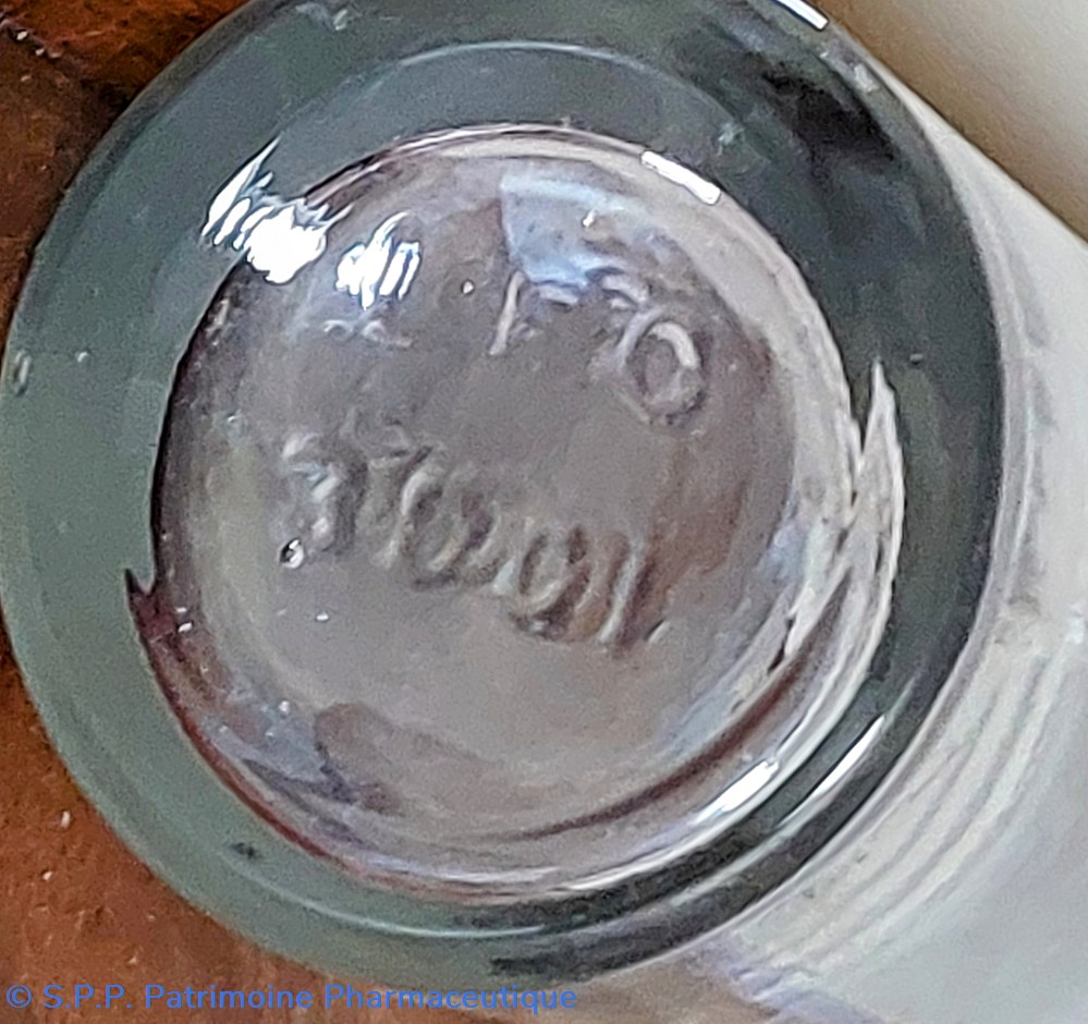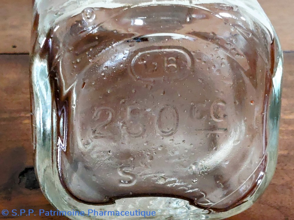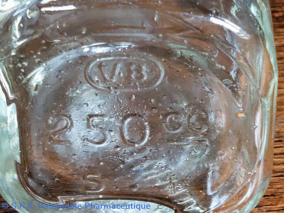 Le dessous du flacon indique 250 Cc avec une marque VB et SI