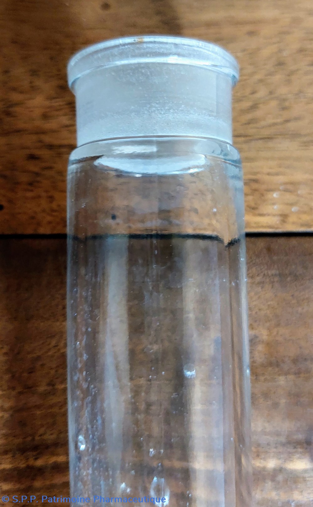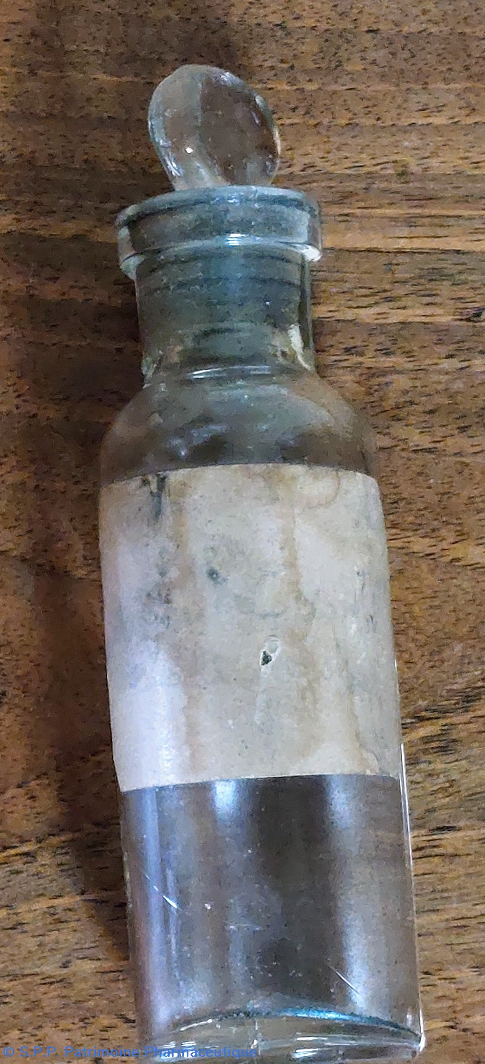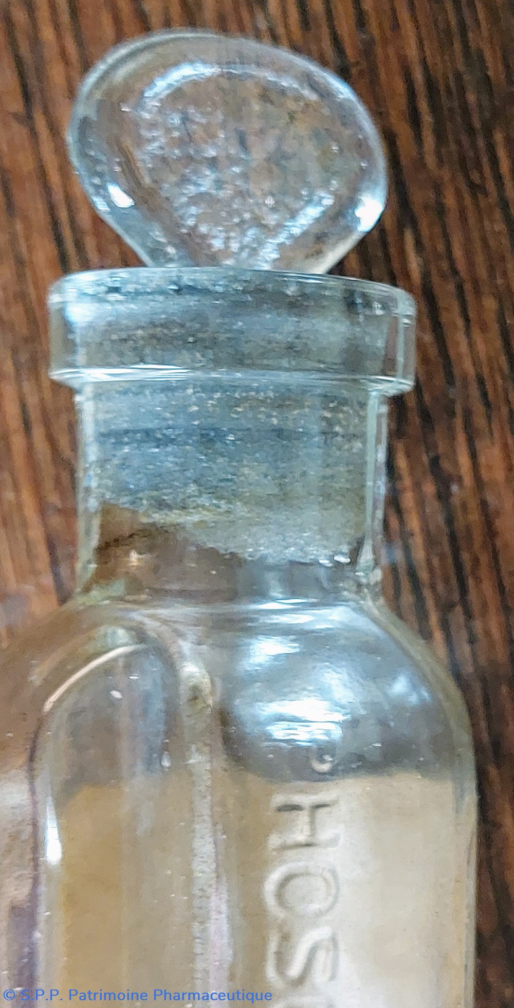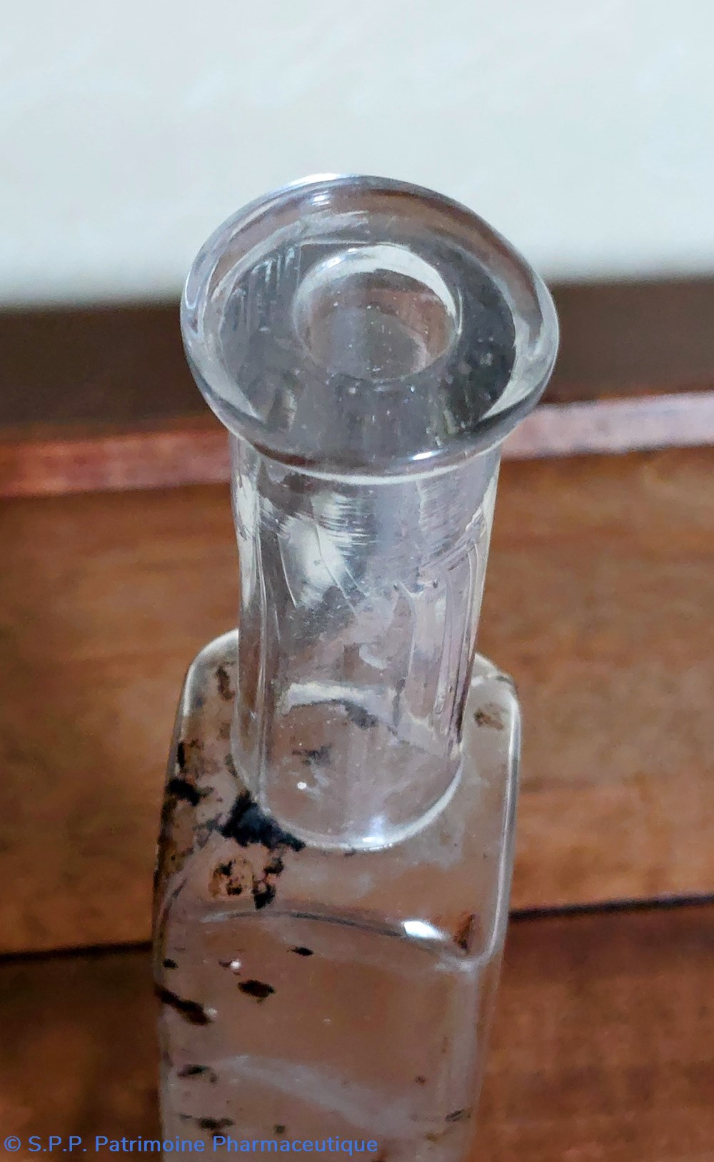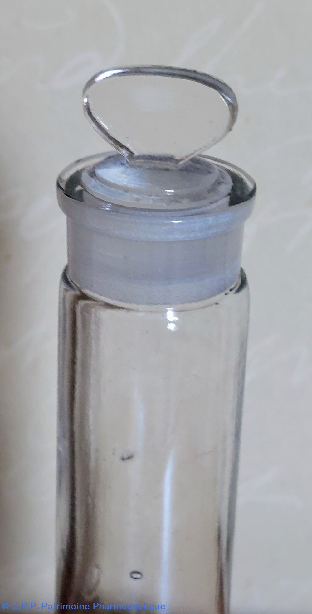 Le col haut de 1.5 cm semble en verre dépoli. Il dispose d'un bouchon en verre en forme d'éventail.