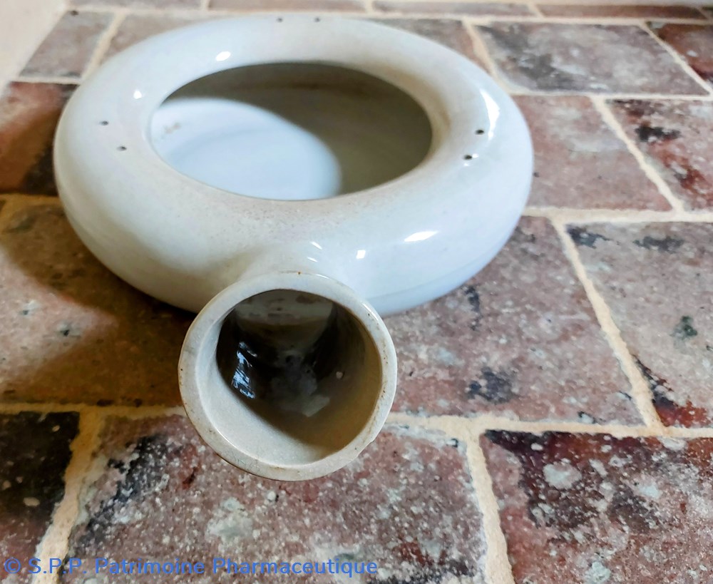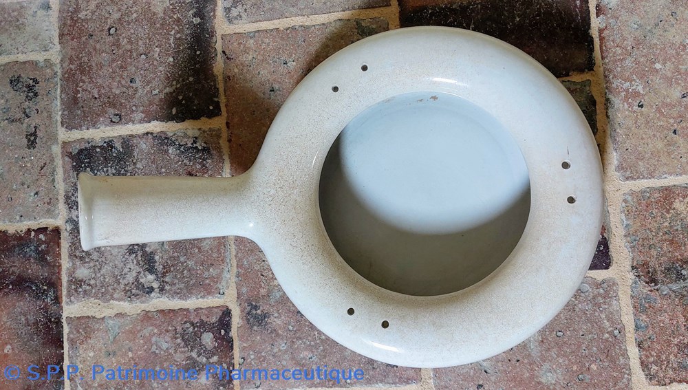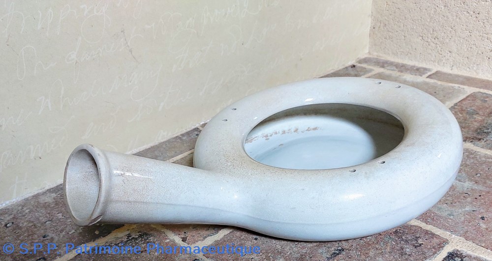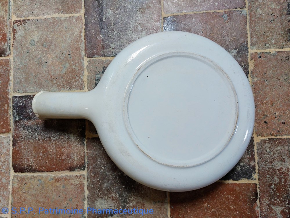 Ancien bassin de lit en faïence blanche ou terre de fer. Provenance inconnue.