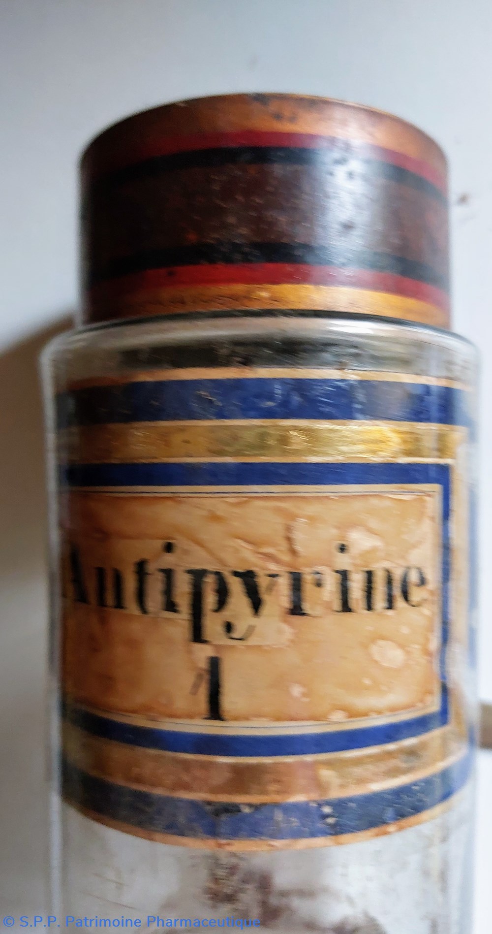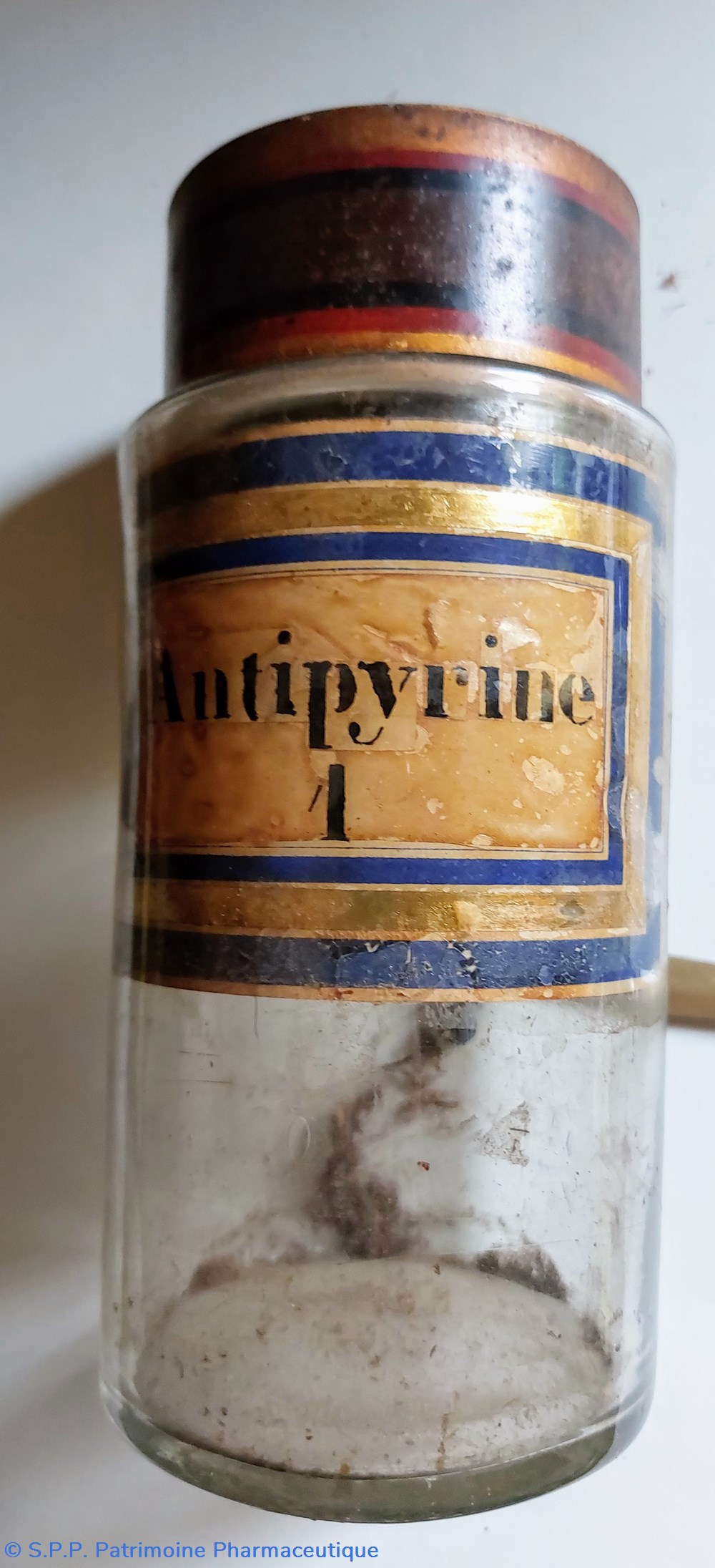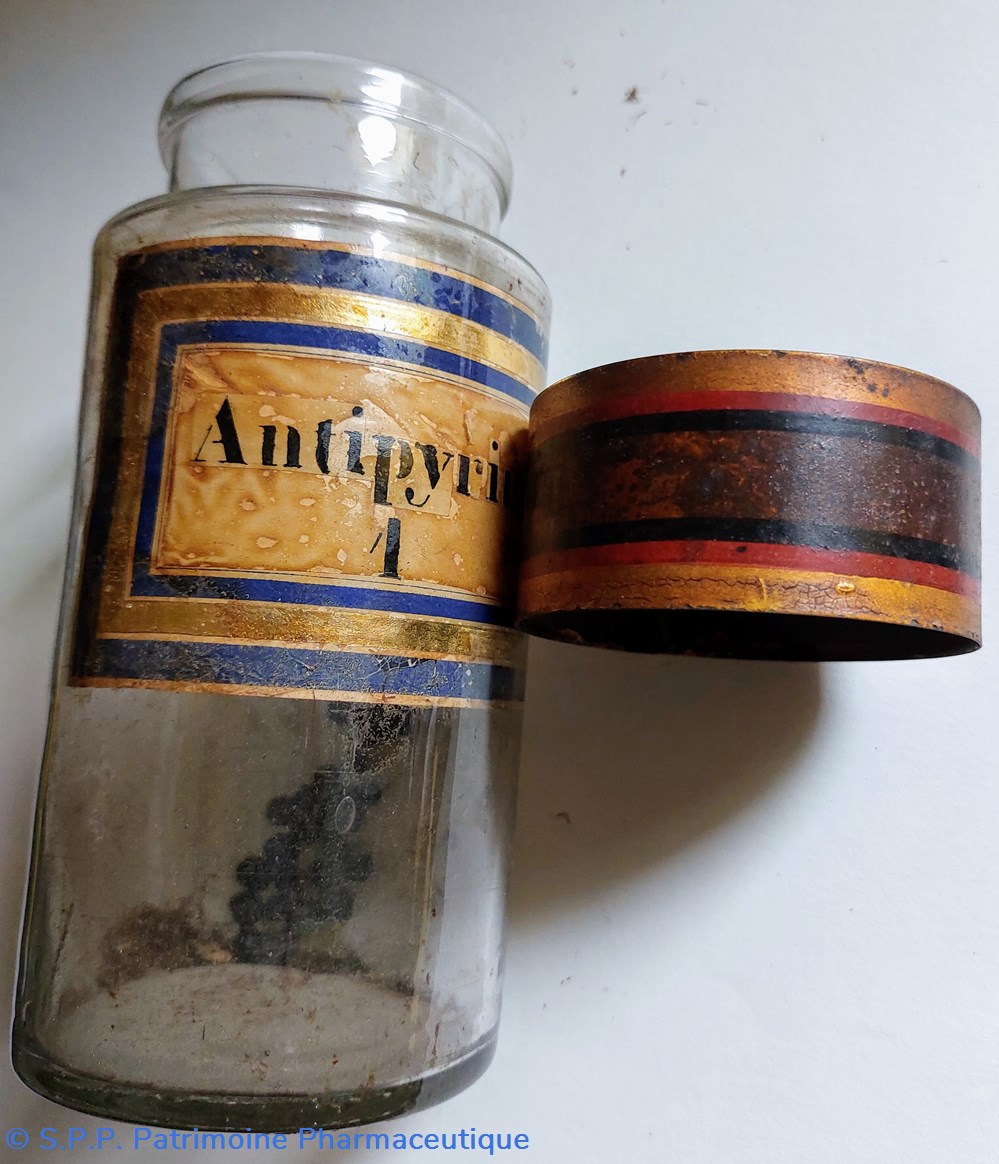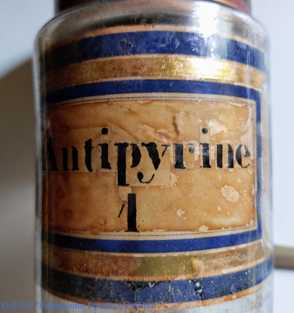 Étiquette intérieure "Antipyrine 1" fond marbré encadrée d'un liseré or et deux bleu marine.