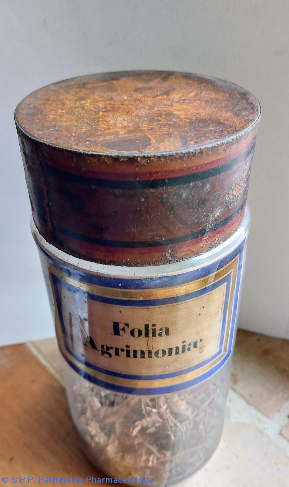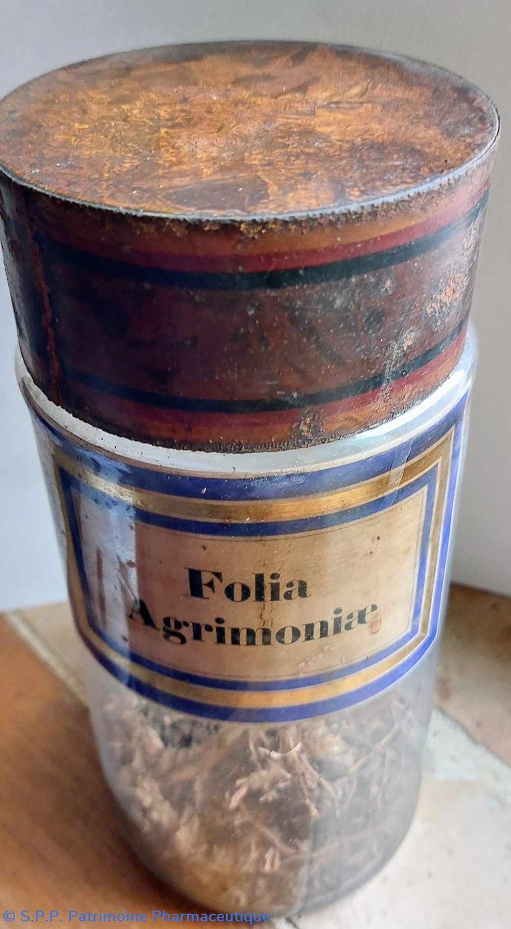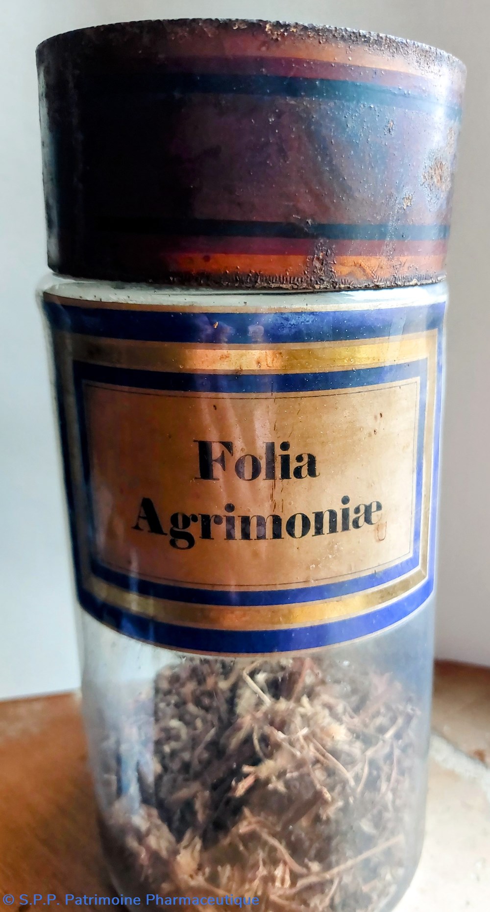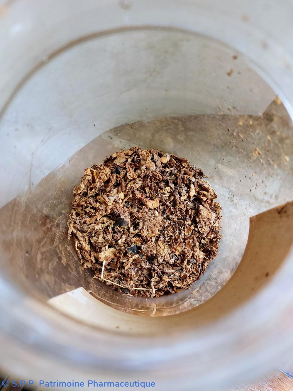 Flacon de Folia Agrimoniae ayant une ouverture de 7 cm de diamètre rempli à 25% de plantes déshydratées.