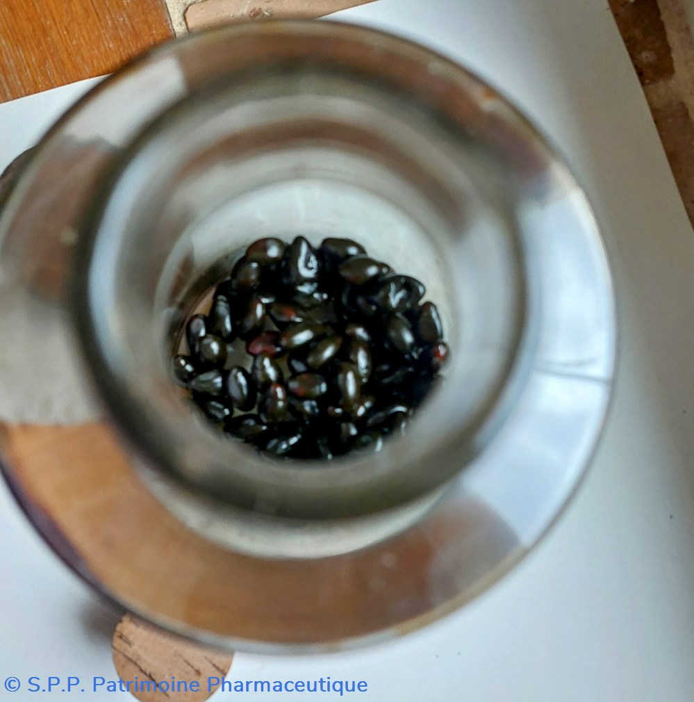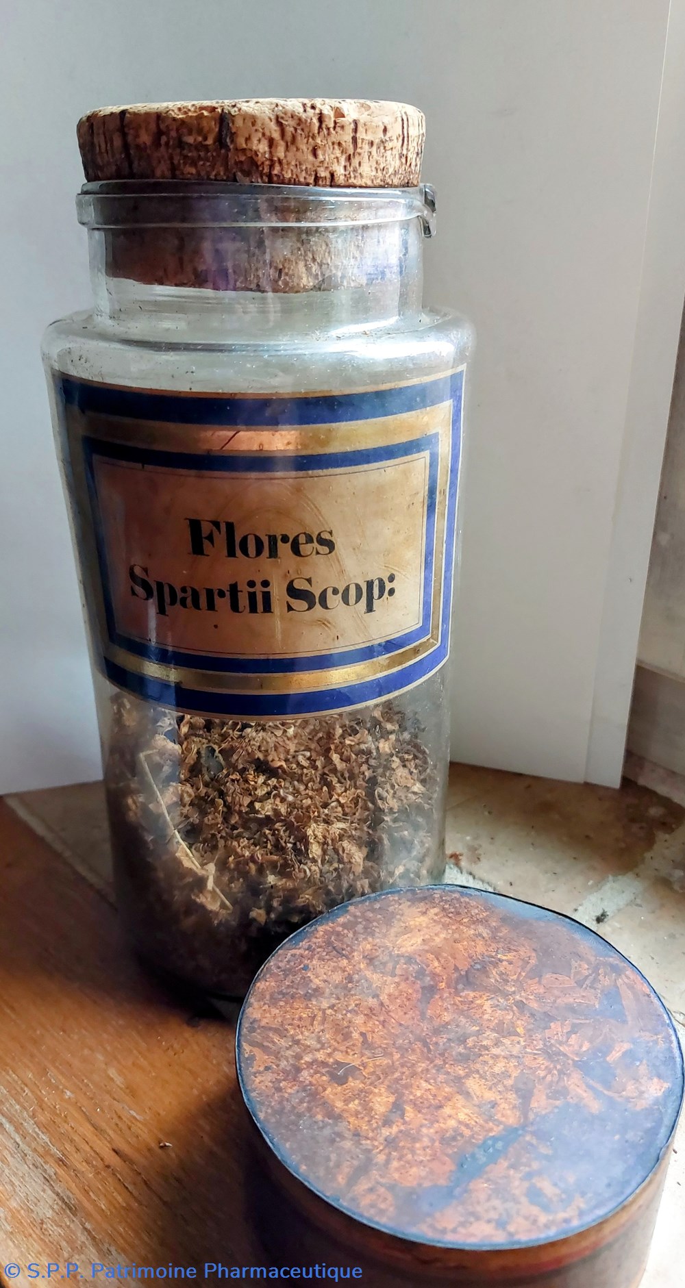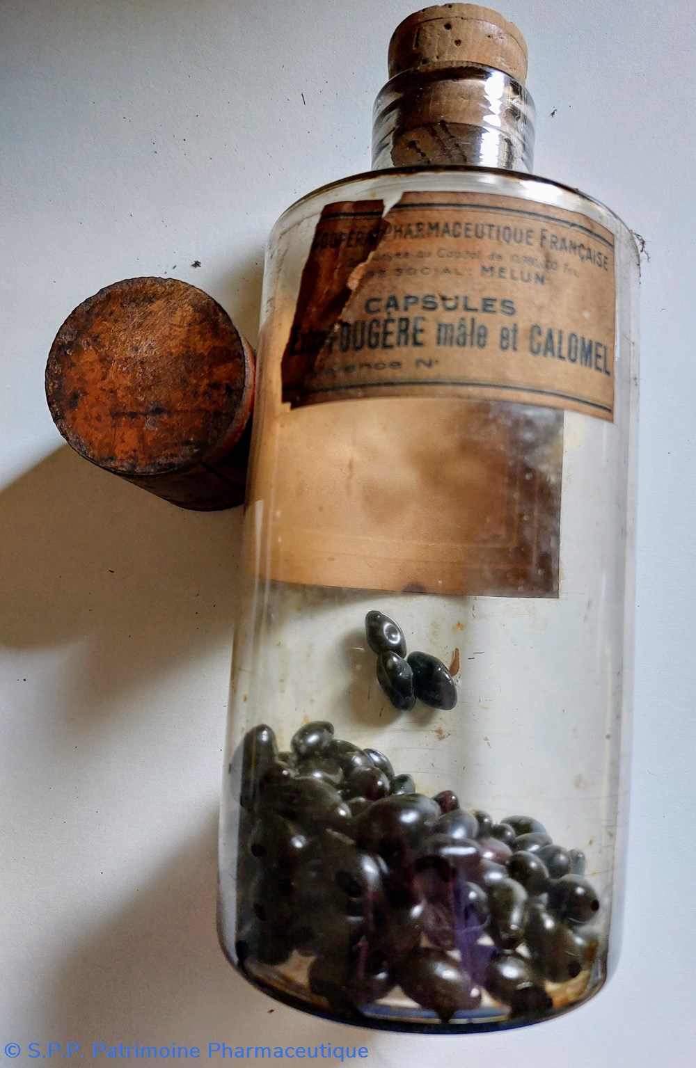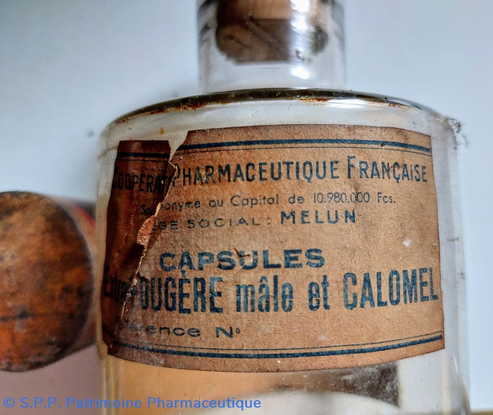 Une étiquette ajoutée à l'extérieur "Capsules Extrait de Fougère mâle et Calomel" étiquette de la Coopérative Pharmaceutique Française à Melun.
