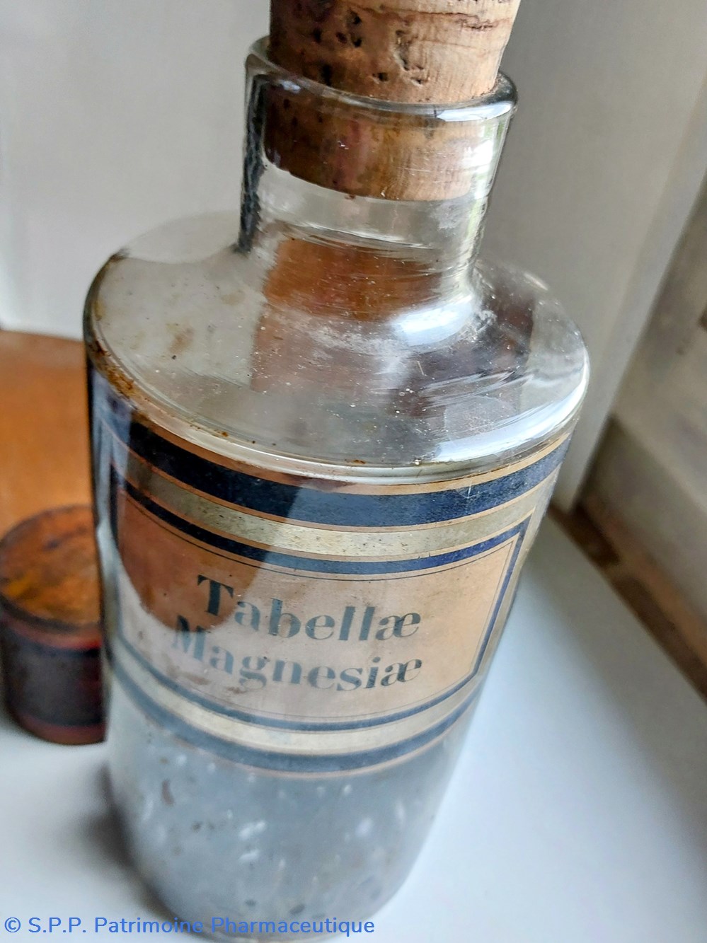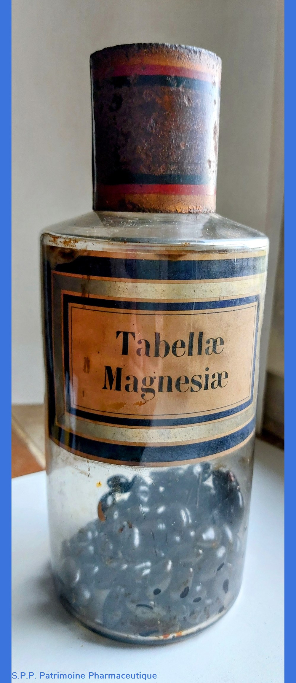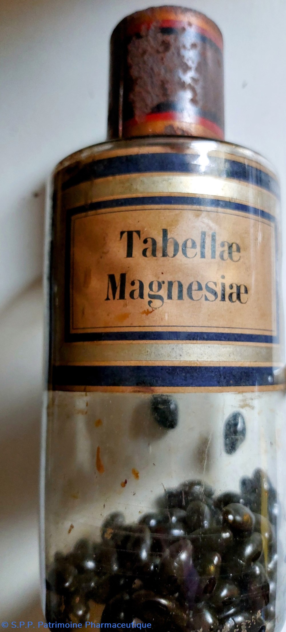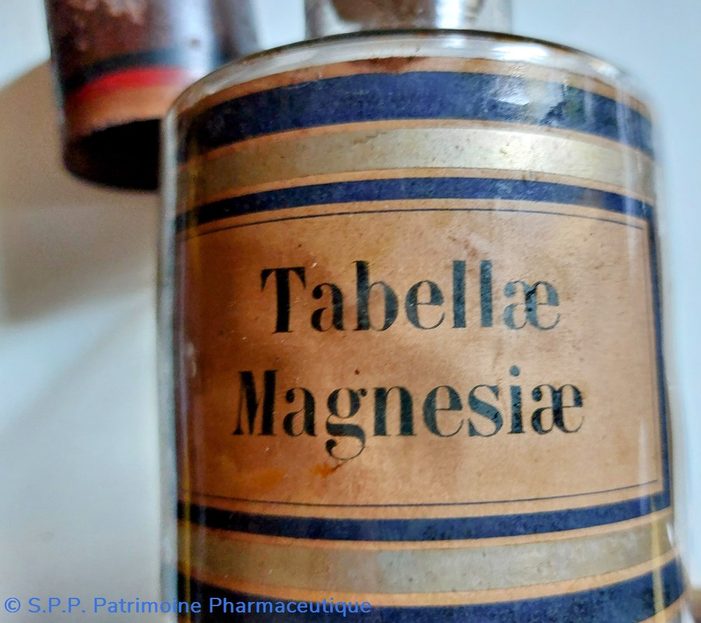 Une étiquette intérieure d'origine "Tabellae Magnesiae" fond marbré encadrée d'un liseré or et 2 bleu marine