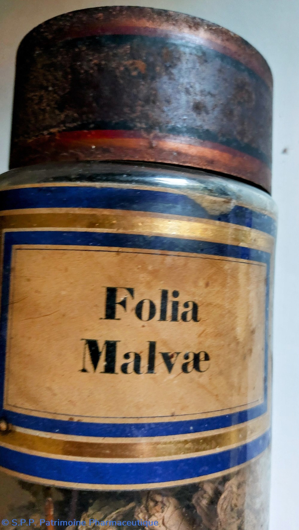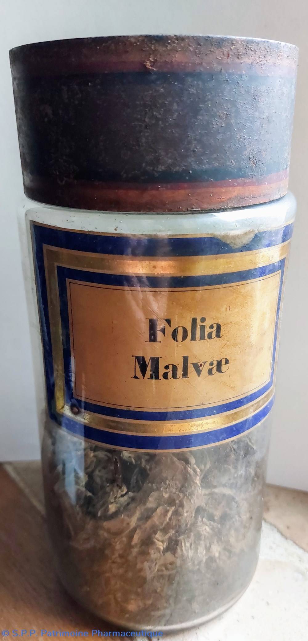 Ce flacon FOLIA MALVAE est rempli à moitié de plantes déshydratées.