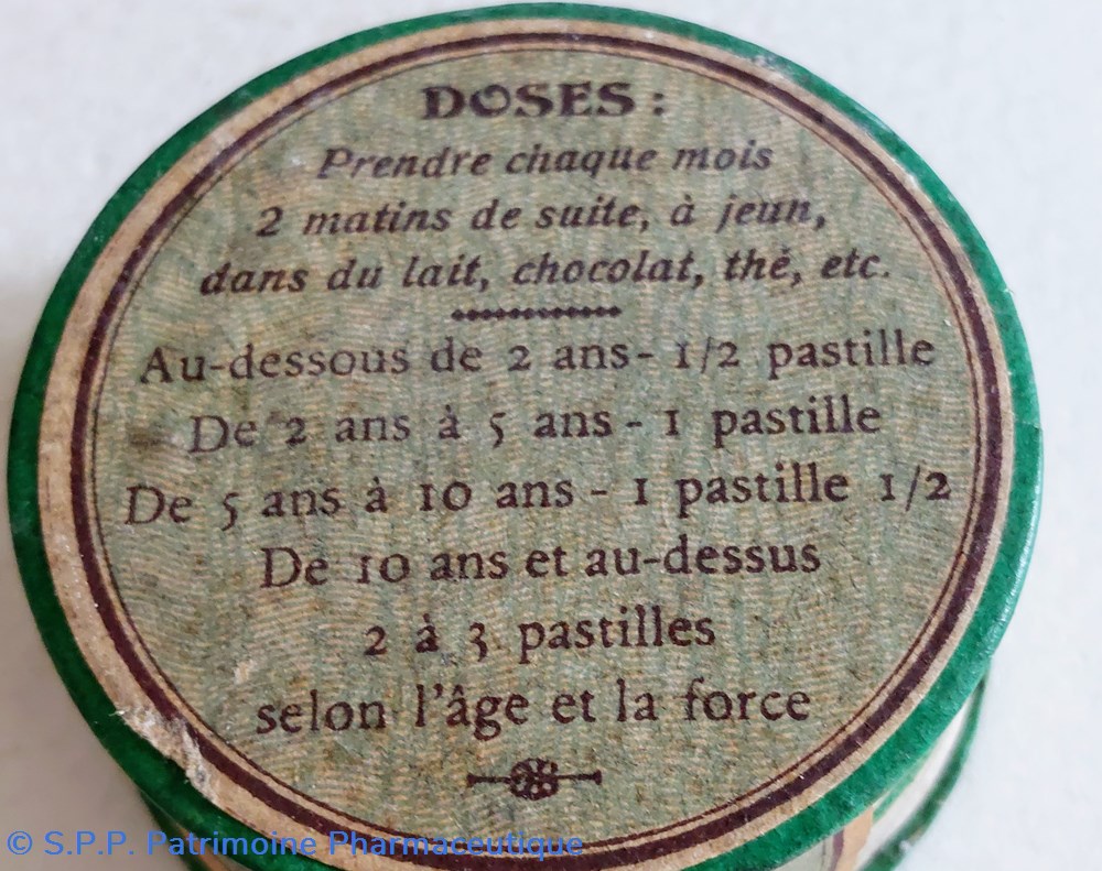 Formule : Chlorure hydrargyreux. Santonine marine, Spigélie, Kamala ââ et Excipient carminé, gomme et sucre