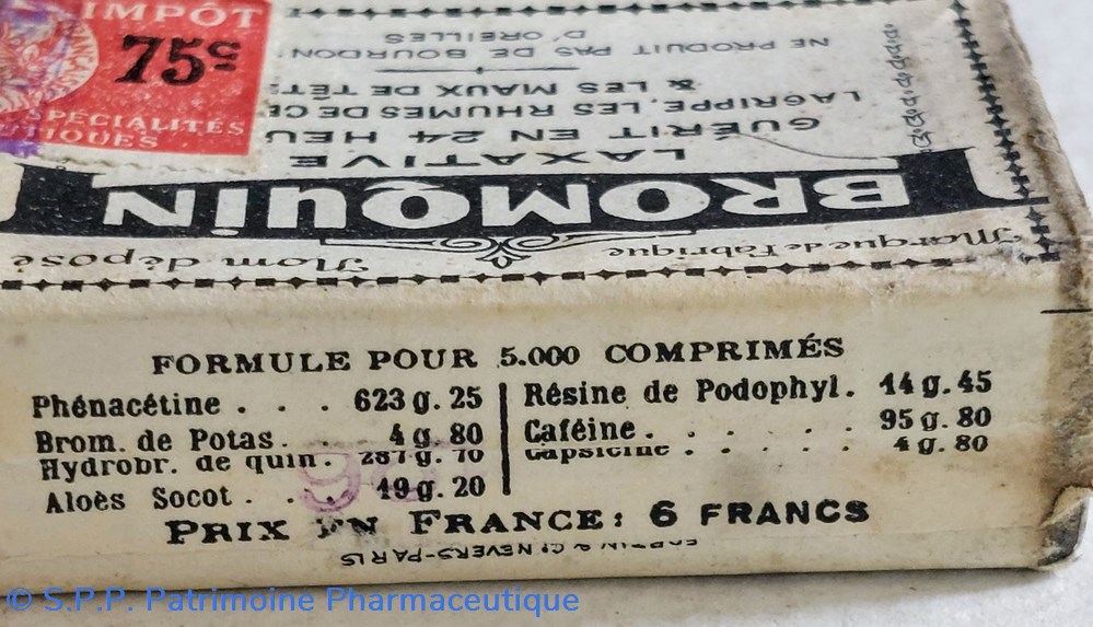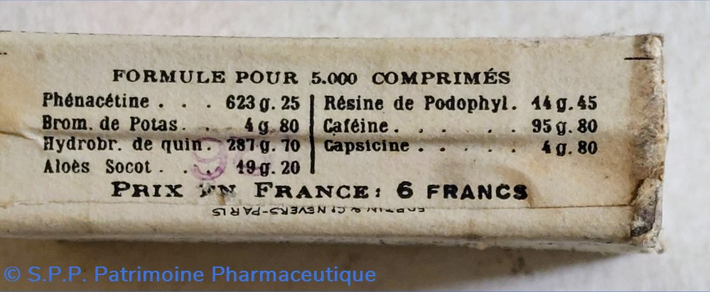 Formule Phénacétine Brom.de Potas. Hydrobr.de quin. Aloes Socot. Résine de Podophyl. Caféine et Capsicine