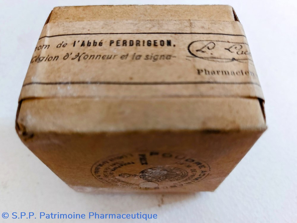 Petit paquet en carton avec bande de garantie contenant La POUDRE ADMIRABLE de l'abbé PERDRIGEON