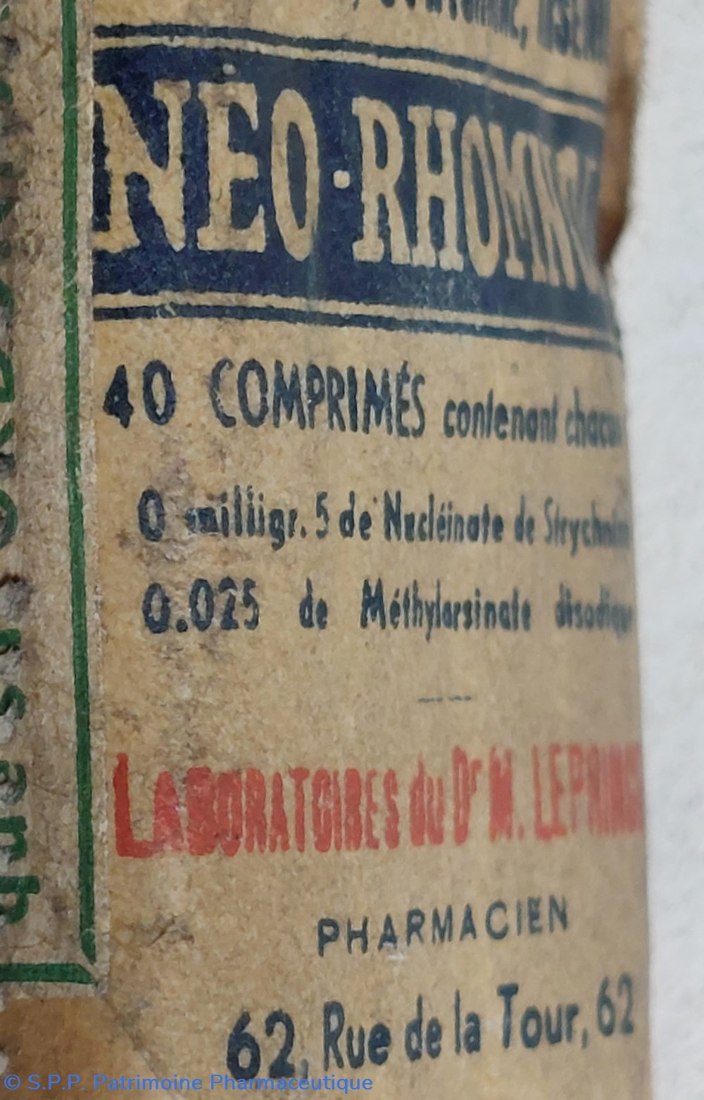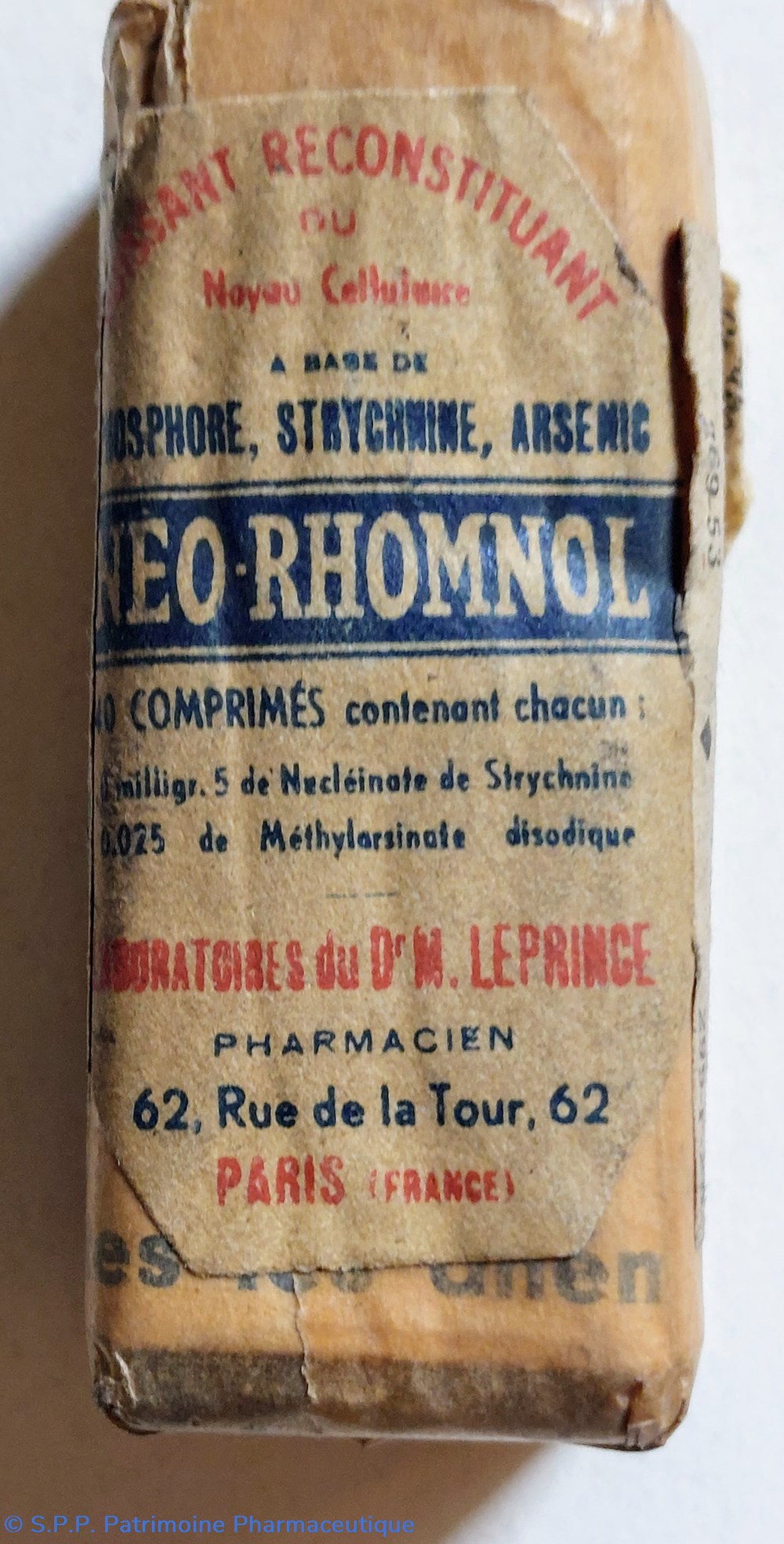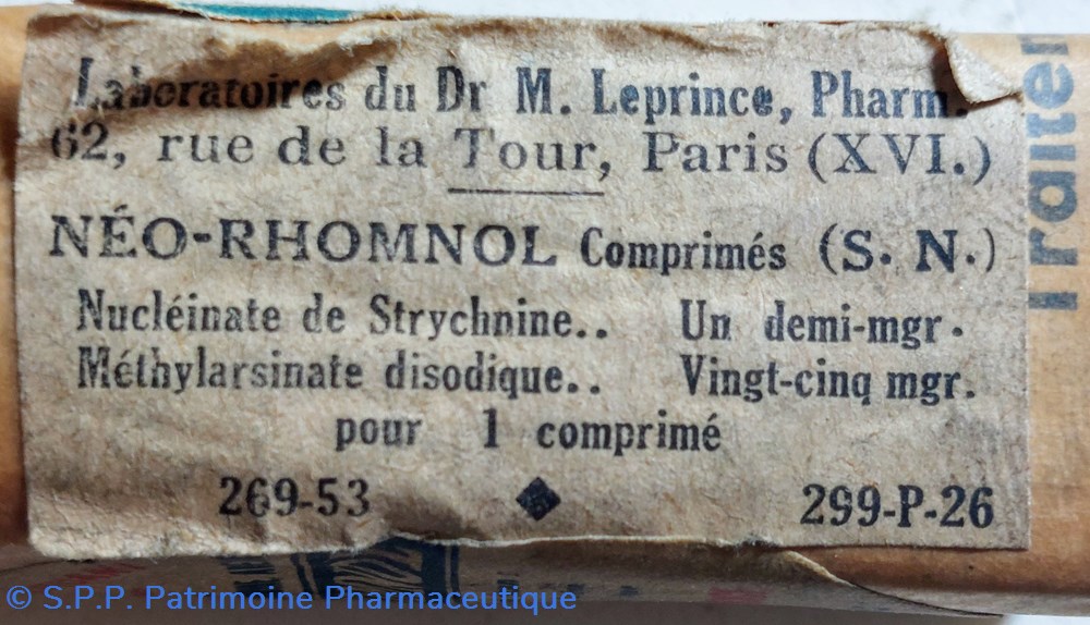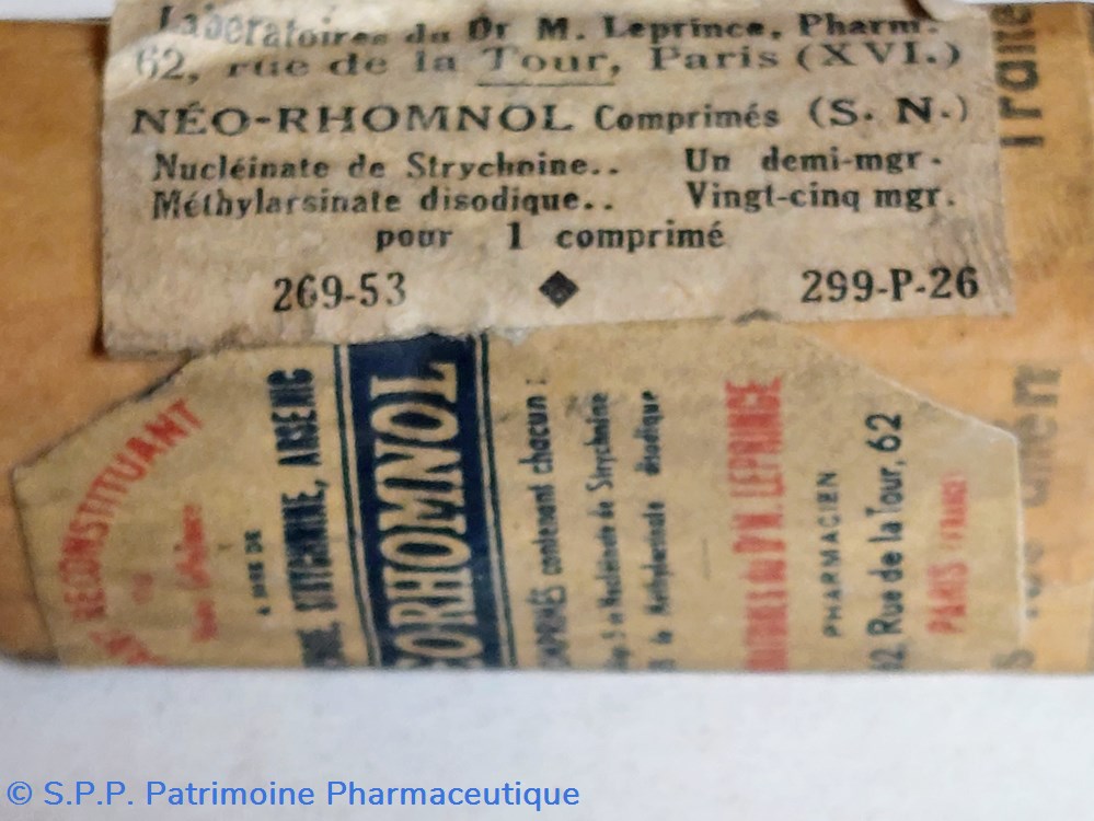 Conditionné sous emballage papier, probablement un flacon de 40 comprimés NÉO RHOMNOL "Puissant Reconstituant ou Noyau cellulaire à base de Phosphore, Strychnine et Arsenic."